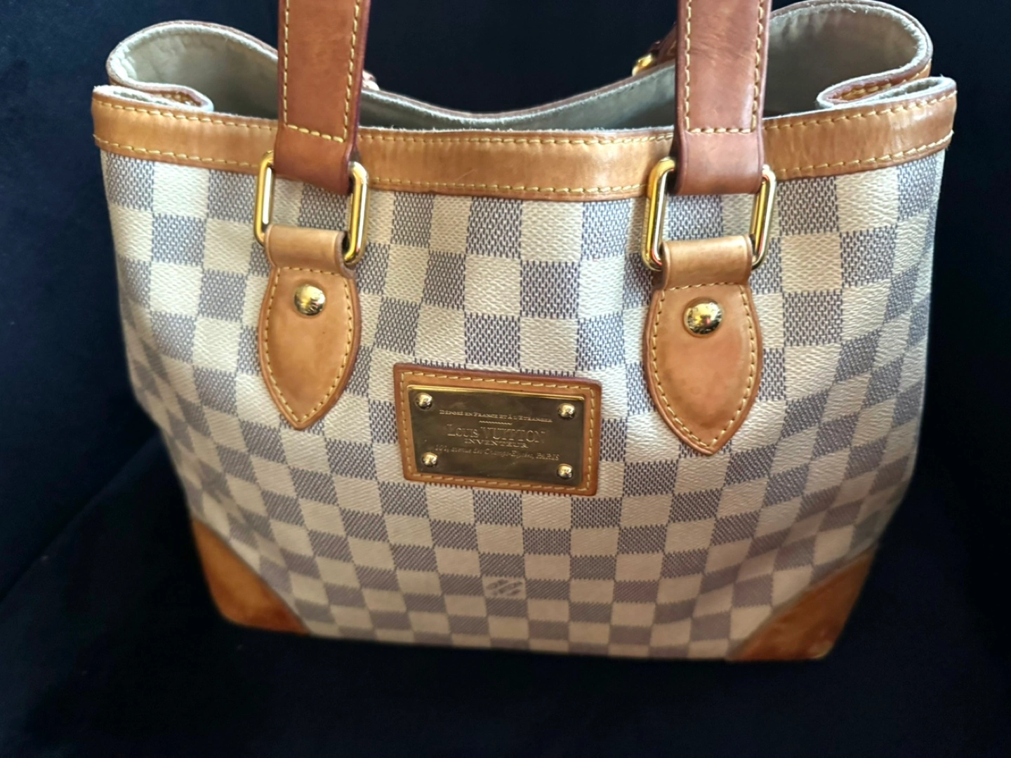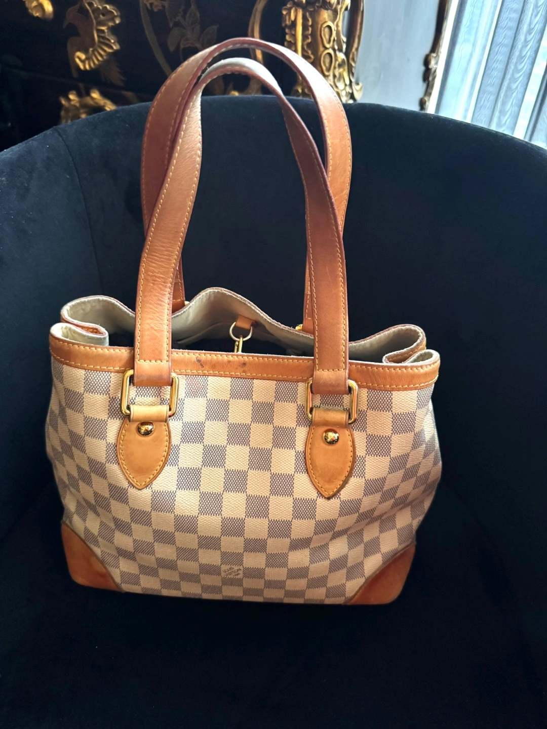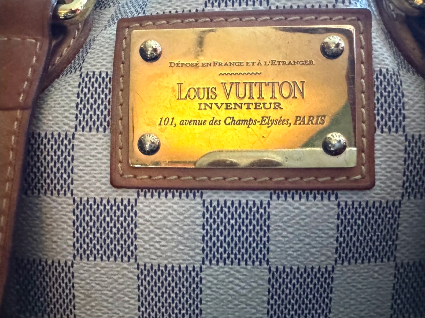 Pre-owned Louis Vuitton handbag. Damier Azur canvas exterior. Tan leather trim and handles. Gold-toned hardware. Classic style. Great everyday bag.