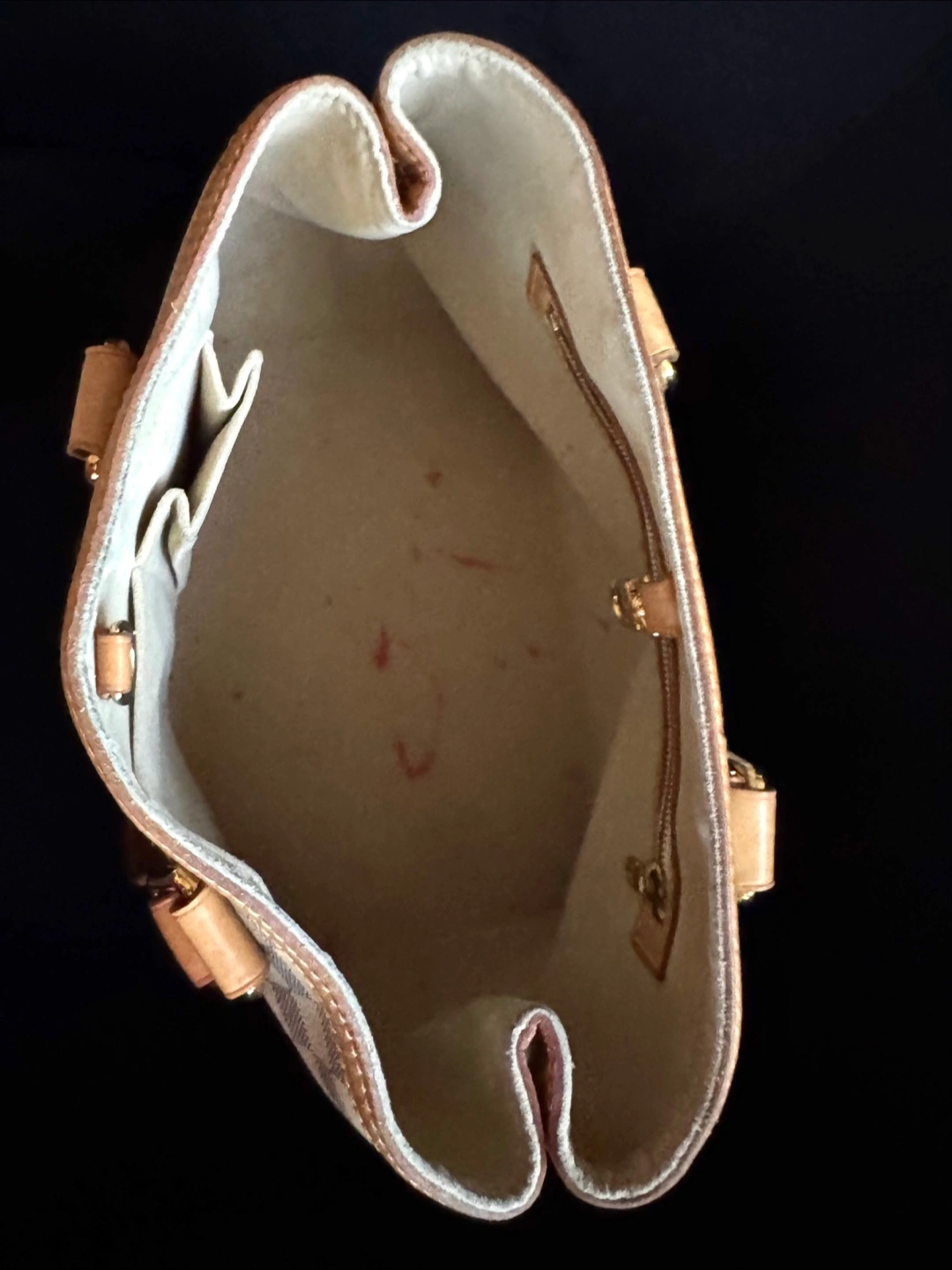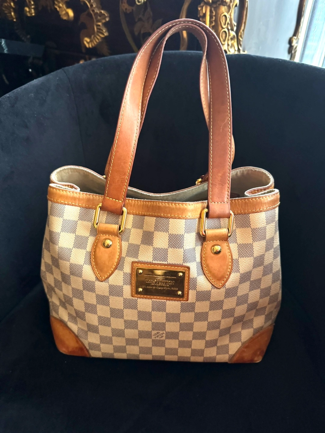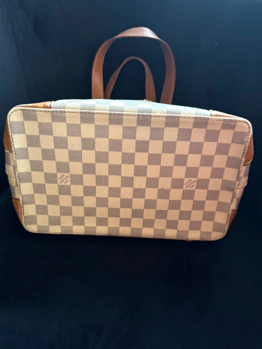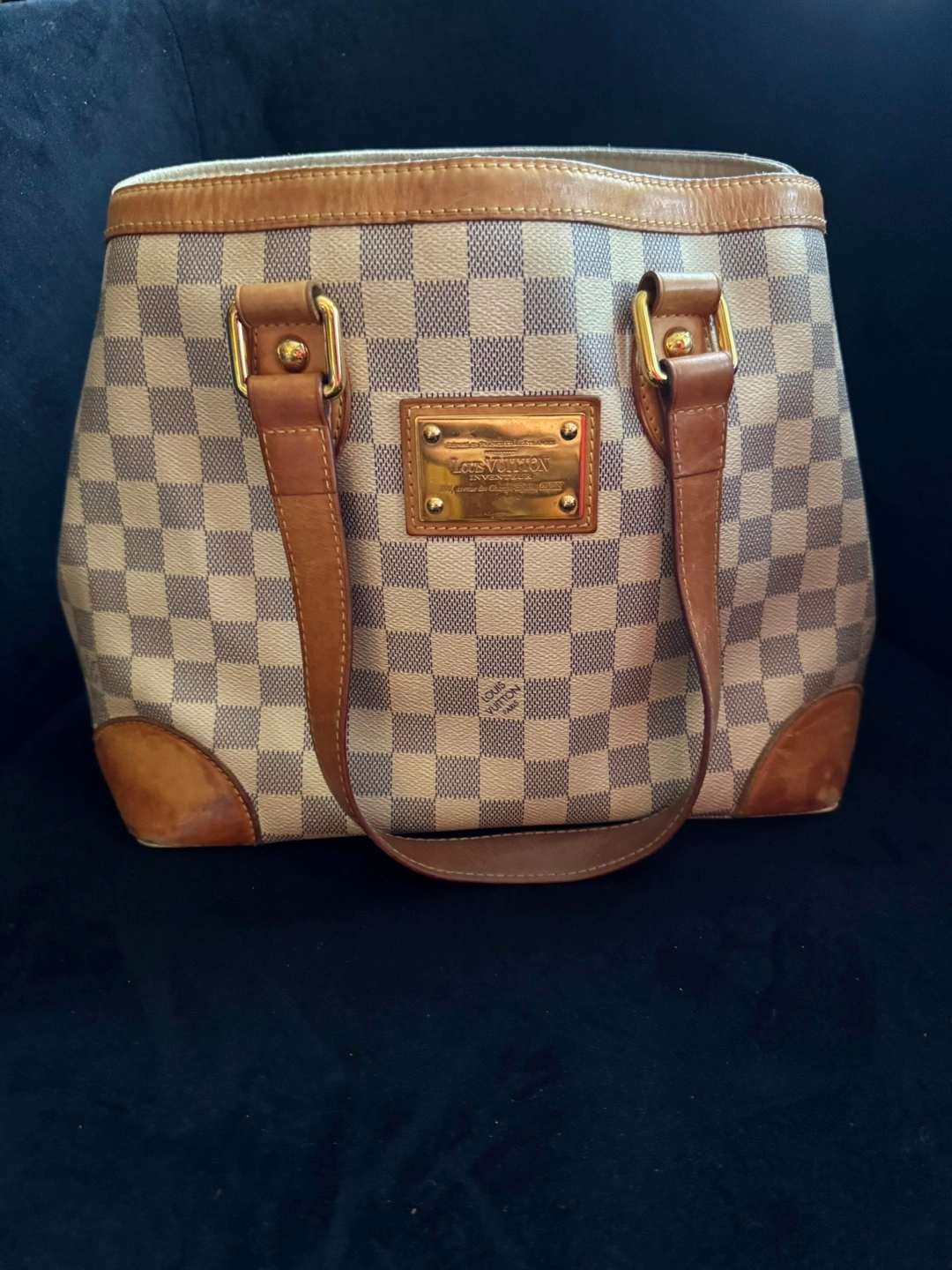 Pre-owned Louis Vuitton handbag. Damier Azur canvas exterior. Tan leather trim and handles. Gold-toned hardware. Classic style. Great everyday bag.