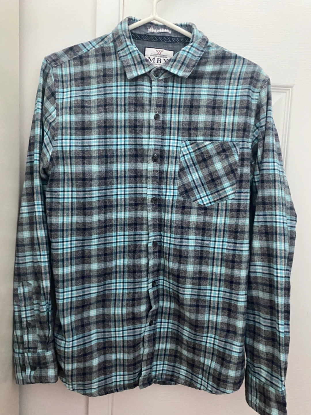 Men's long-sleeve shirt. Blue and grey plaid pattern. Medium size.