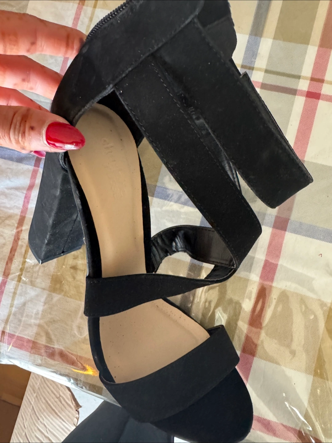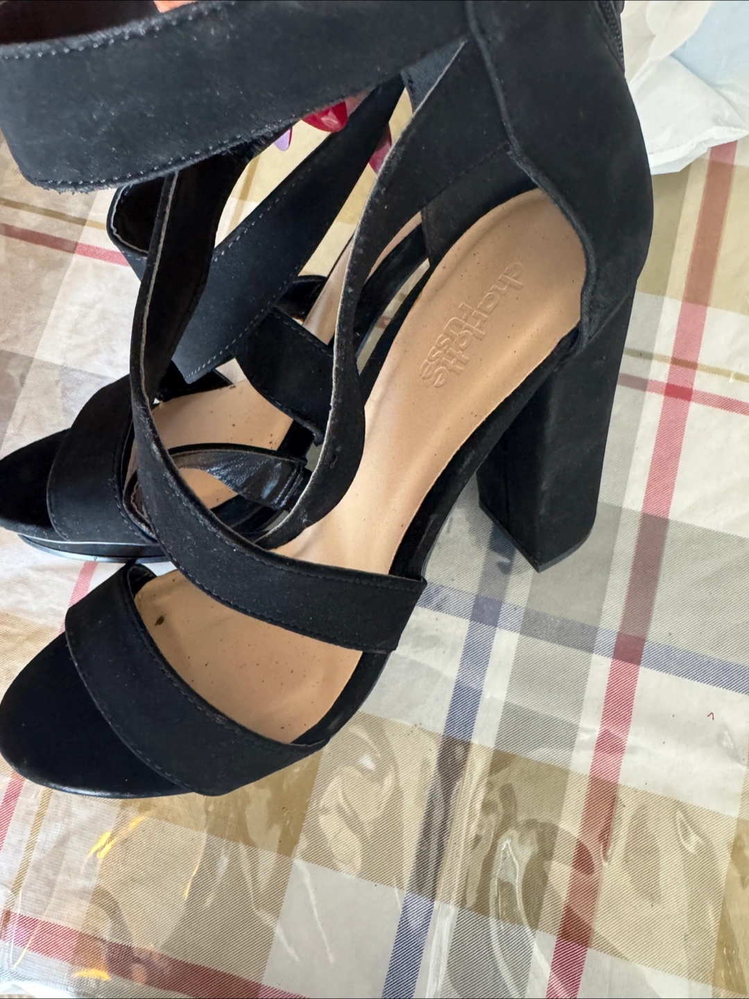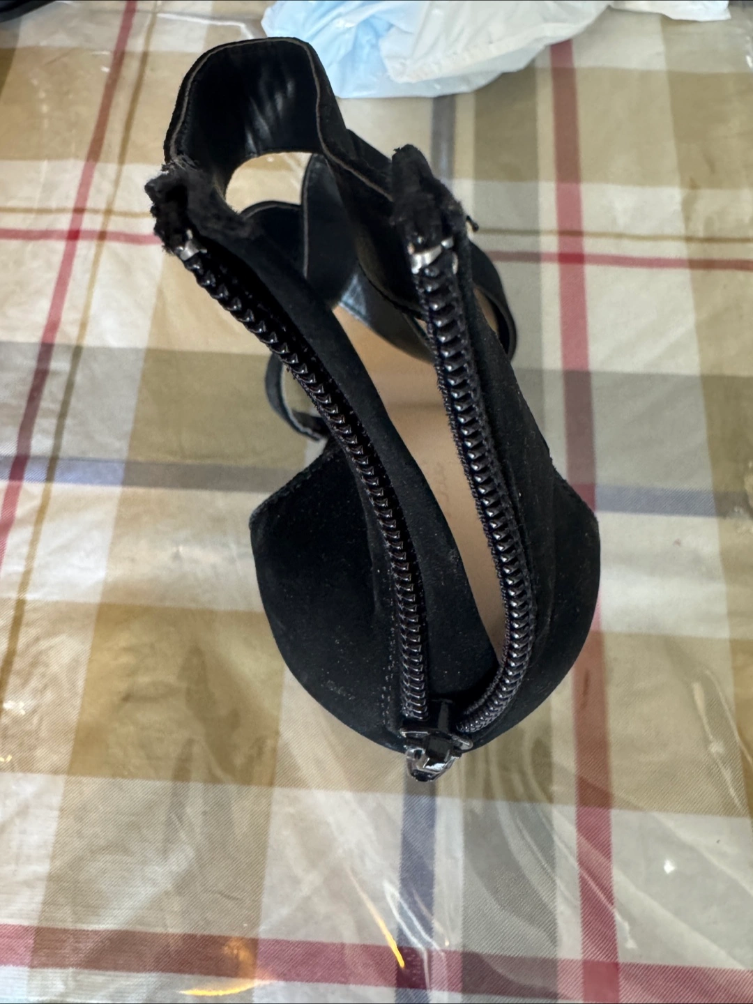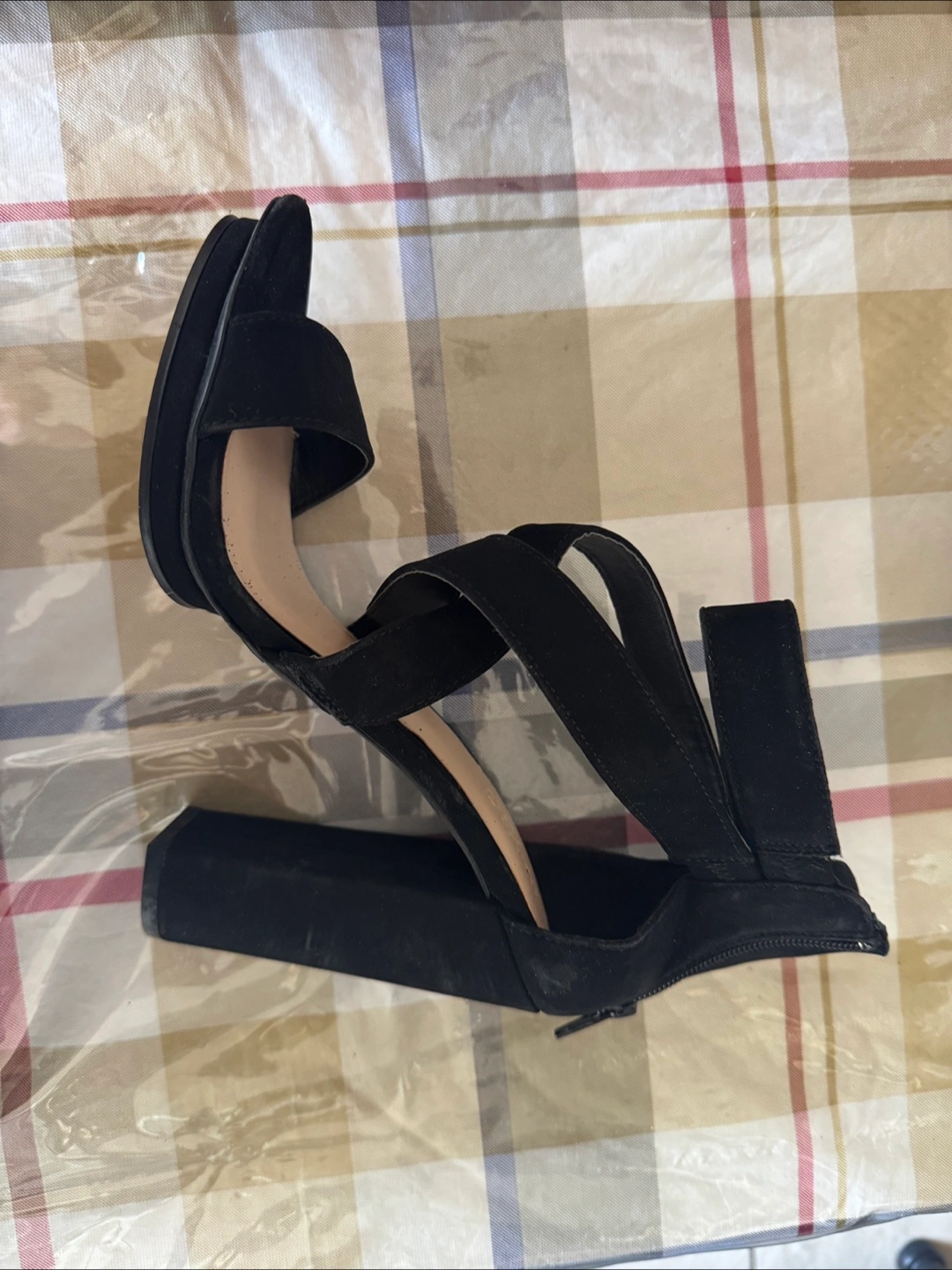 Womens black suede-look chunky heel sandals. Ankle zip closure. Open toe. Cross-over straps. Platform sole.