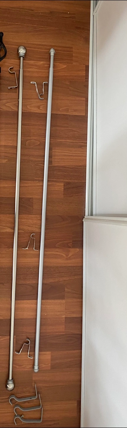Two extendable curtain rods, one silver 6’9’’ and one gray 6’ 14’’ include finials . Silver rod includes one bracket but I have spare ones that could be used, they are adjustable.