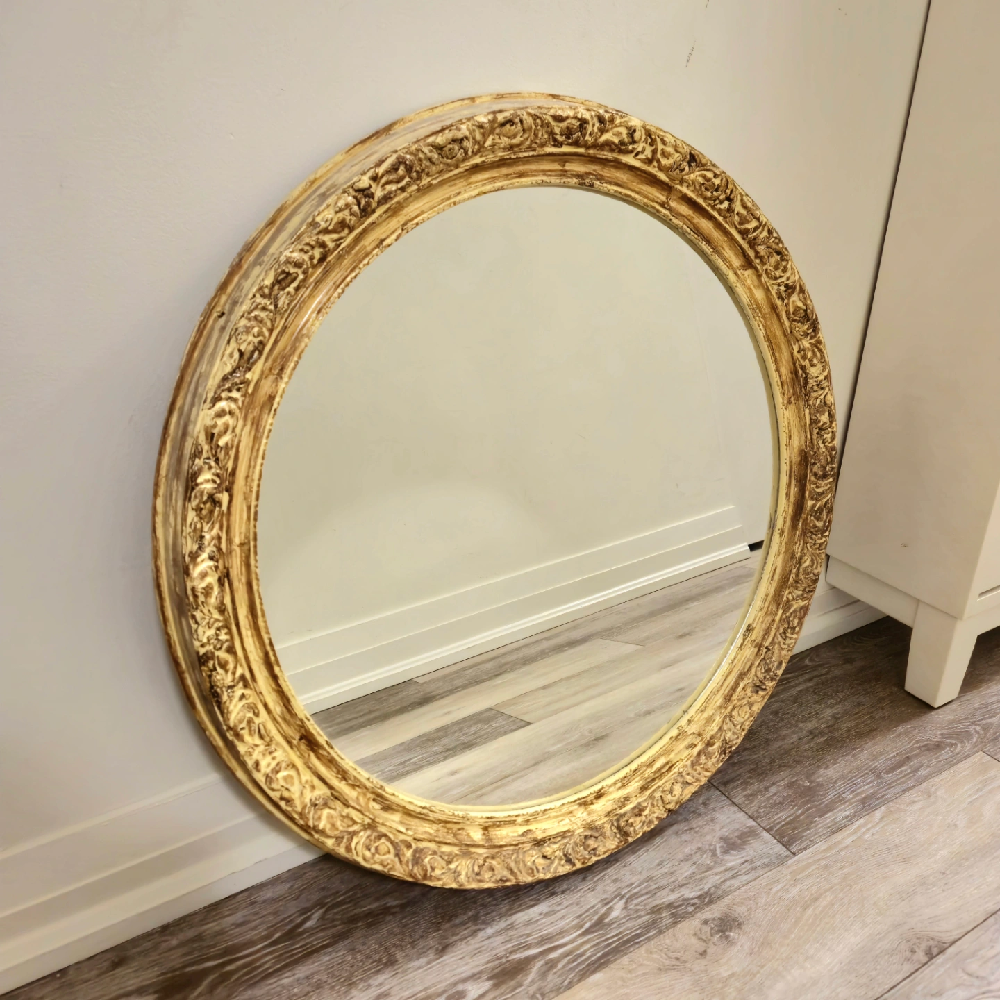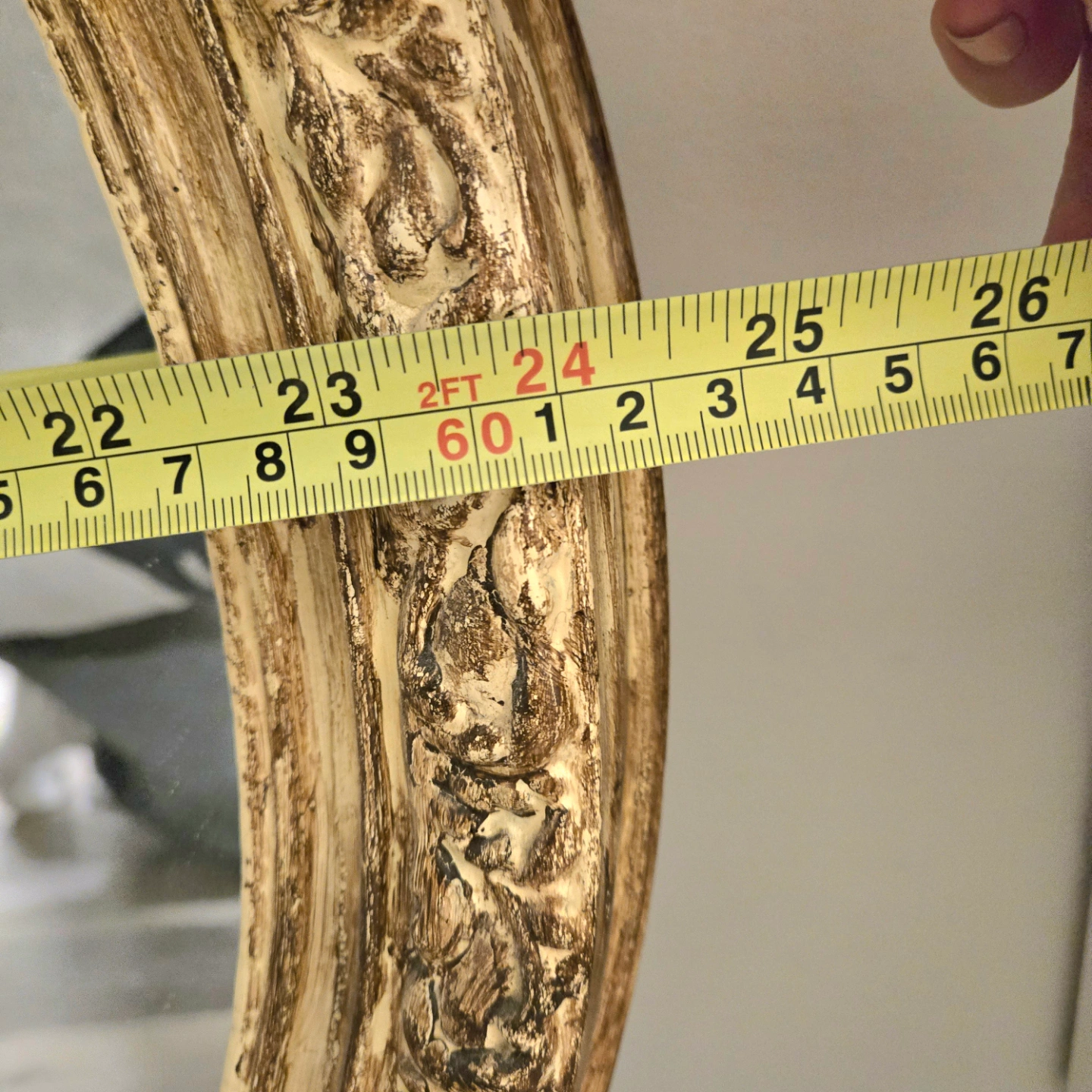 Beautiful round mirror. Ornate frame. Distressed finish. Measures approximately 24.5 inches in diameter.
