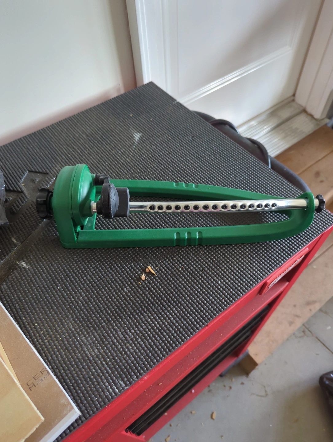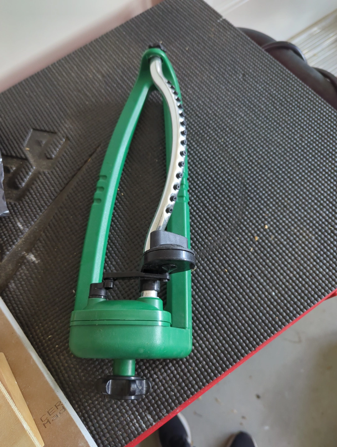 Green plastic sprinkler. Adjustable spray. Great for watering gardens and lawns. Used condition. I have 2 of these.