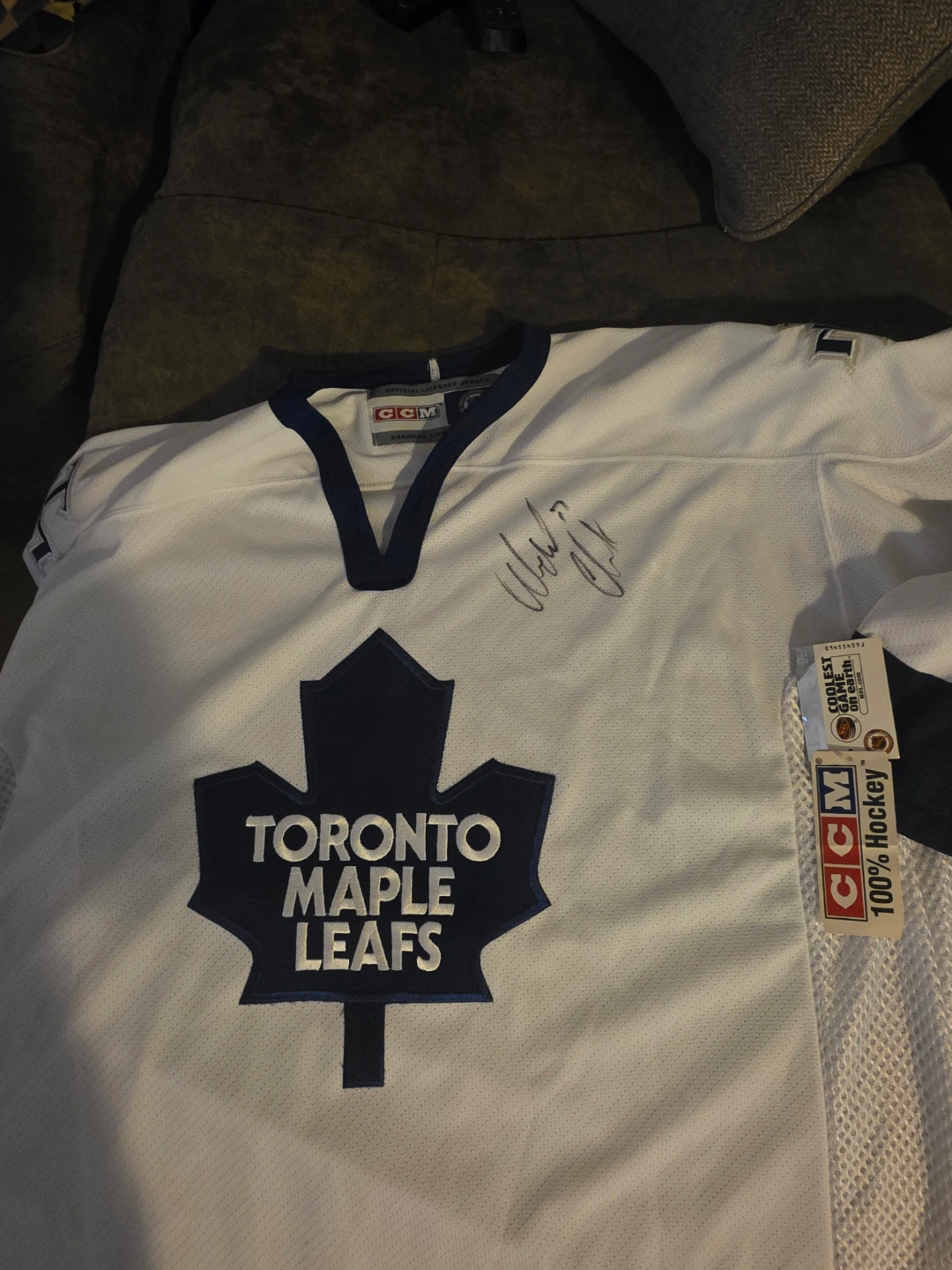 Vintage CCM Toronto Maple Leafs jersey. Wendl Clark autograph. White with blue and white Maple Leafs logo.