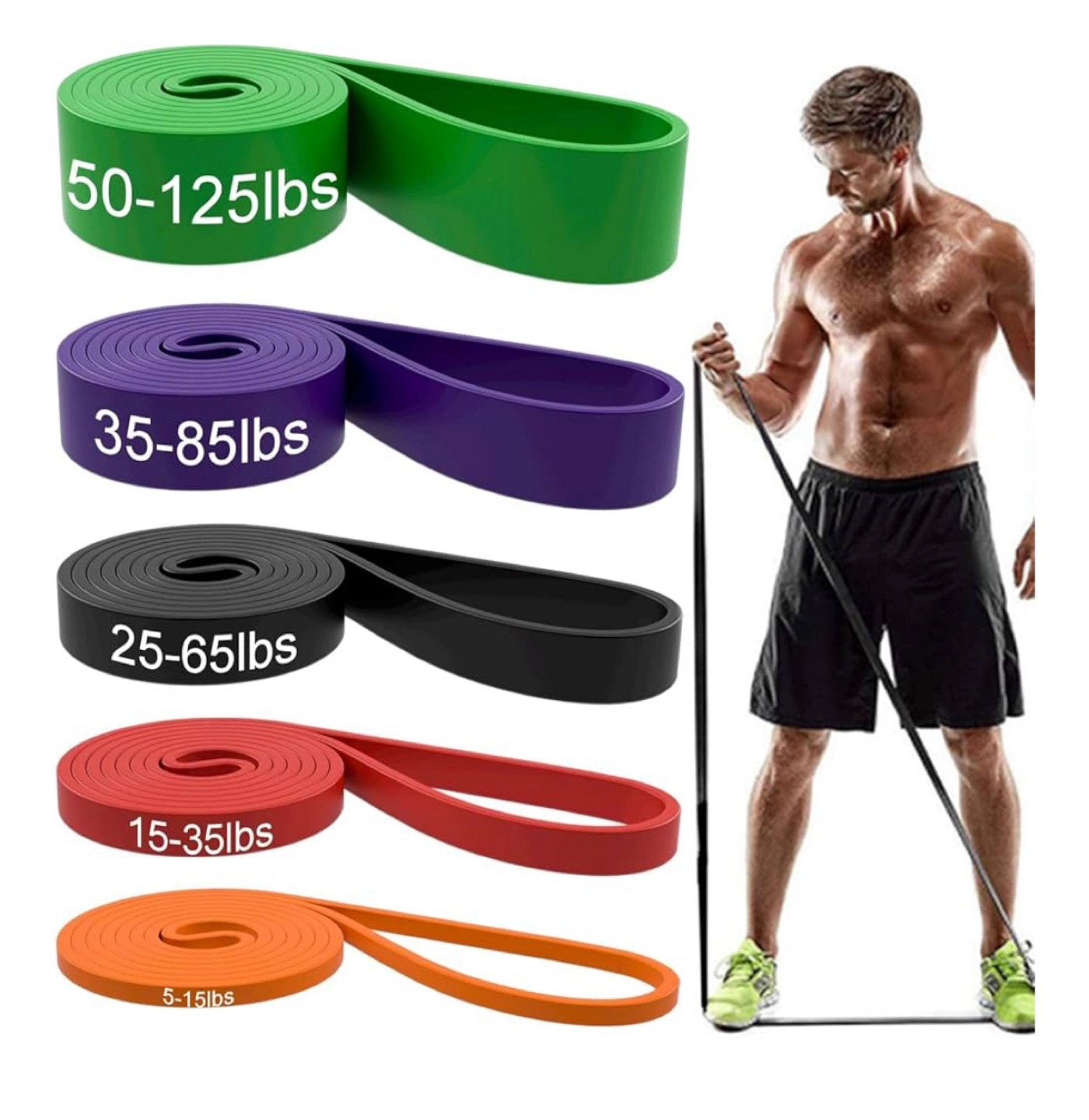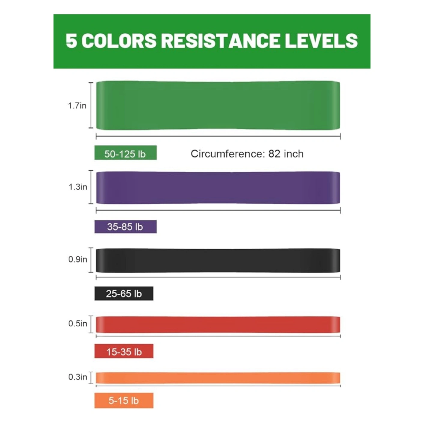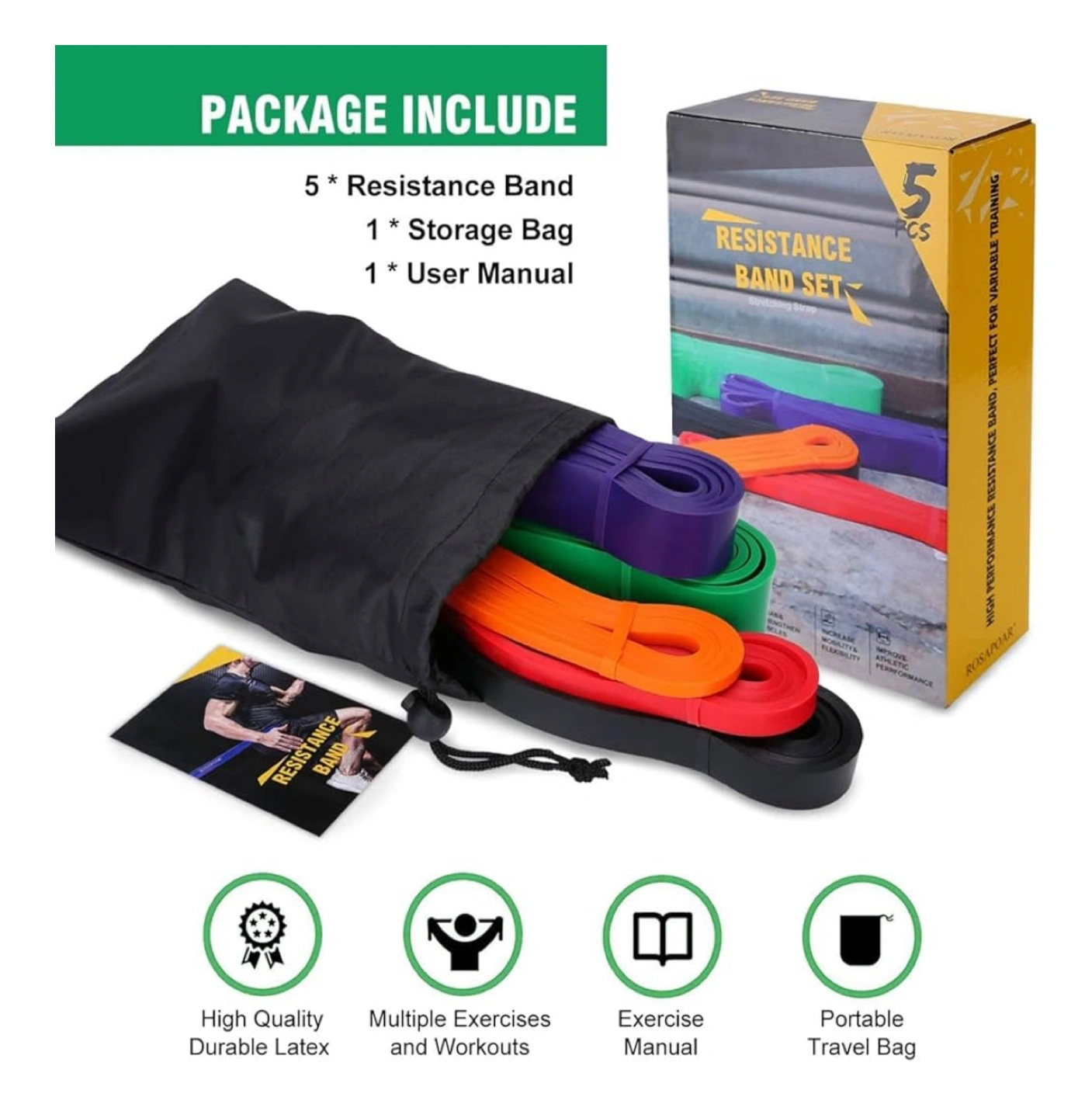Five resistance bands, various resistance levels. Great for building strength and muscle. Perfect for home or gym workouts. Multiple exercises possible.