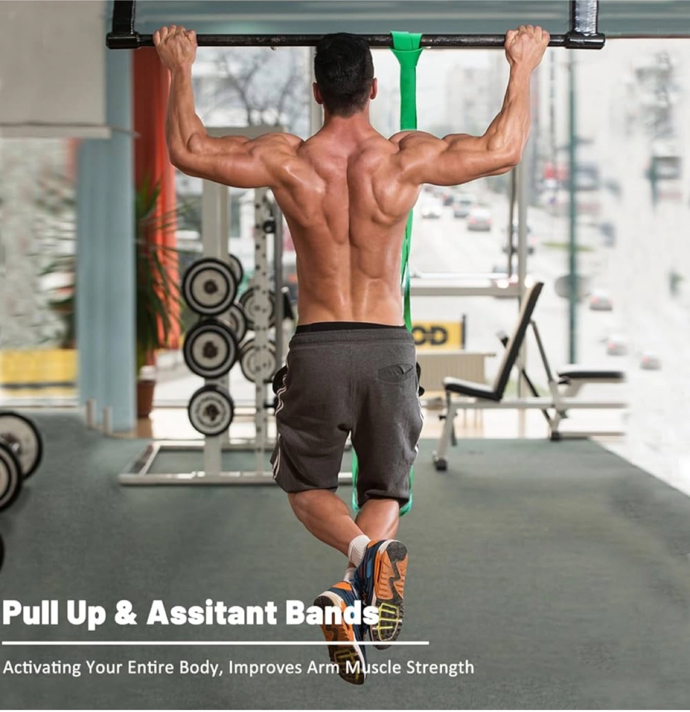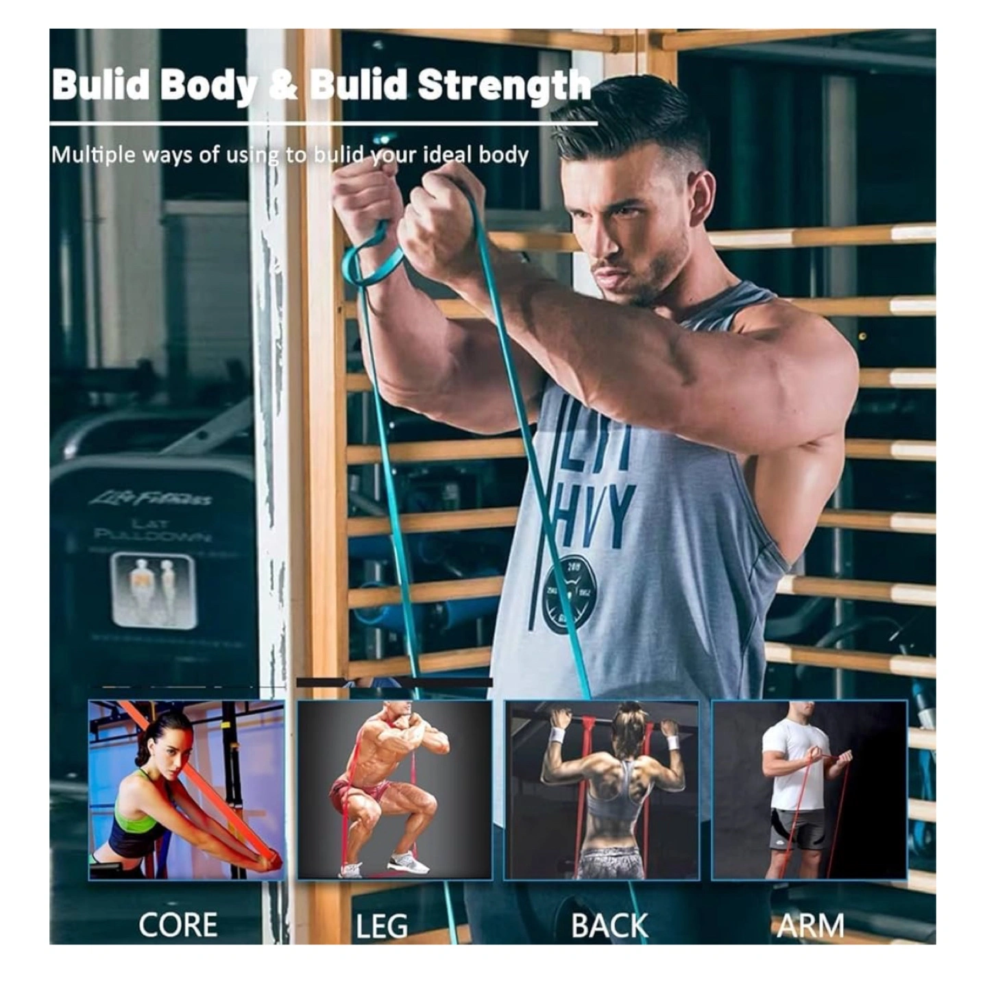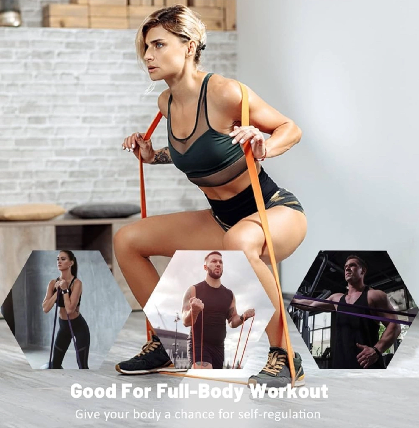Five resistance bands, various resistance levels. Great for building strength and muscle. Perfect for home or gym workouts. Multiple exercises possible.