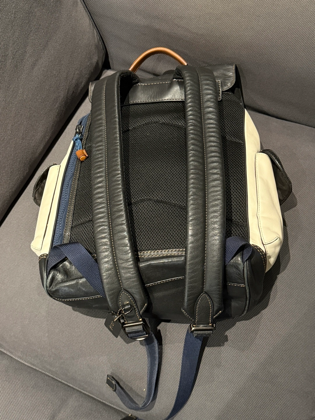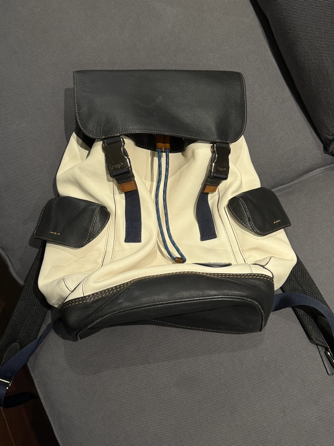 Pre-owned Coach leather backpack. Two-toned design, off-white and black leather. Drawstring closure and multiple pockets. Adjustable straps. Roomy interior. Minor wear. Still got lots of life!