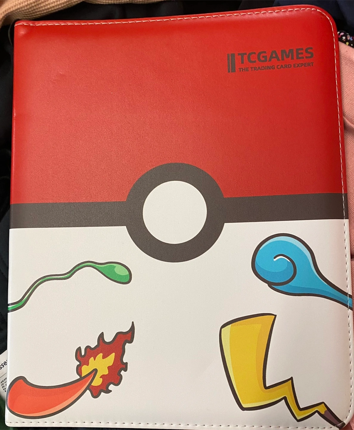 Red Pokémon binder. Features a Pokéball and elemental type designs. Holds numerous cards. Great for collectors.