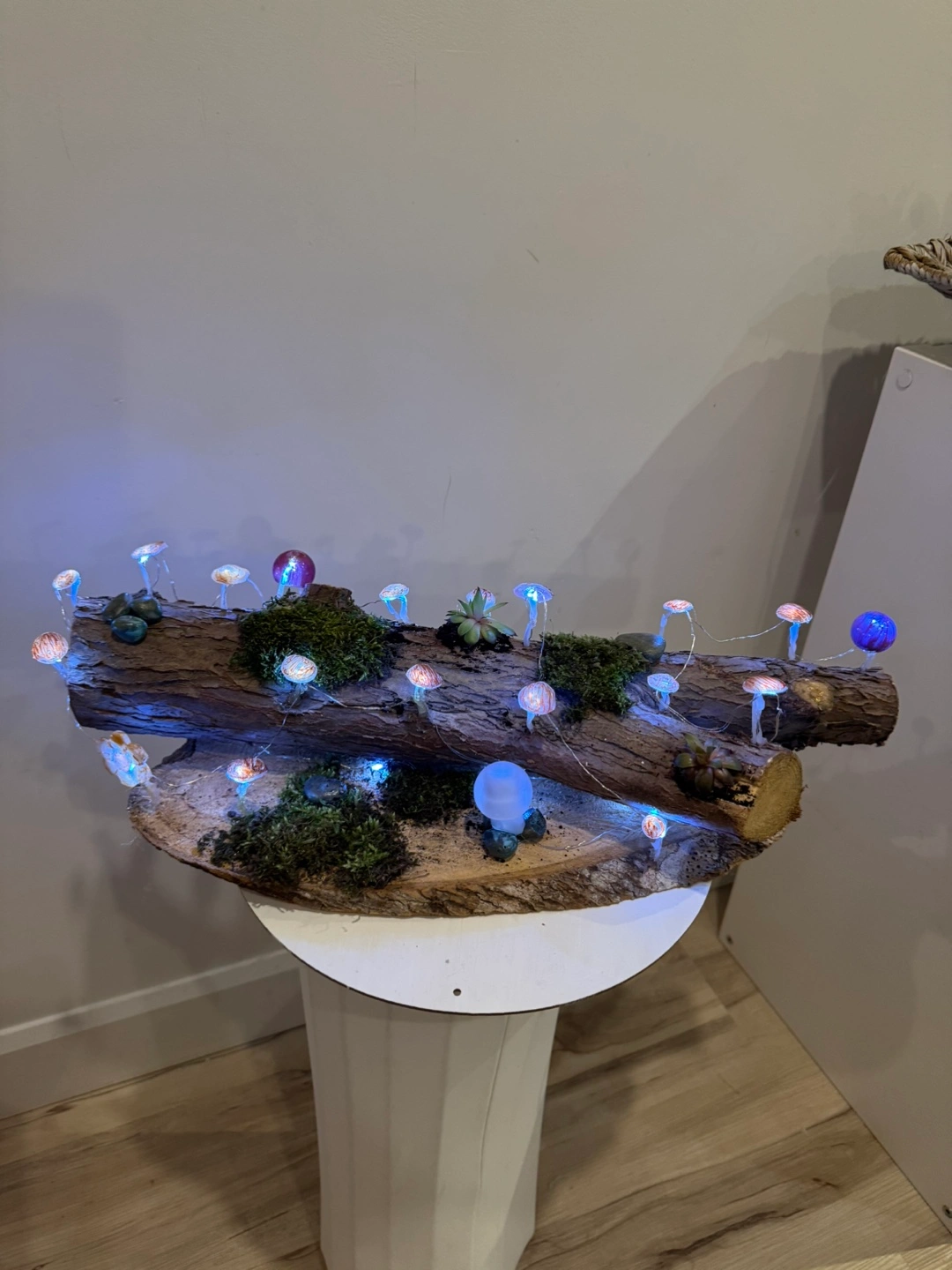 Unique handcrafted terrarium. Features miniature mushrooms with LED lights, succulents, moss, and stones. Set on a log and wooden base. Adds whimsical charm to any space.