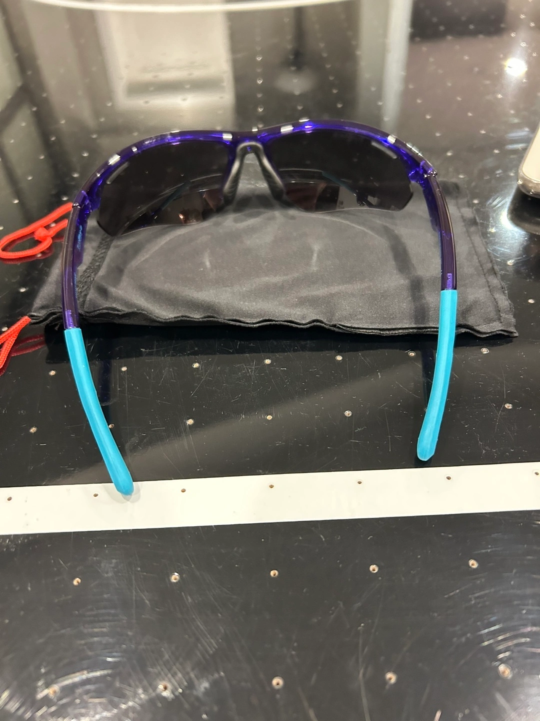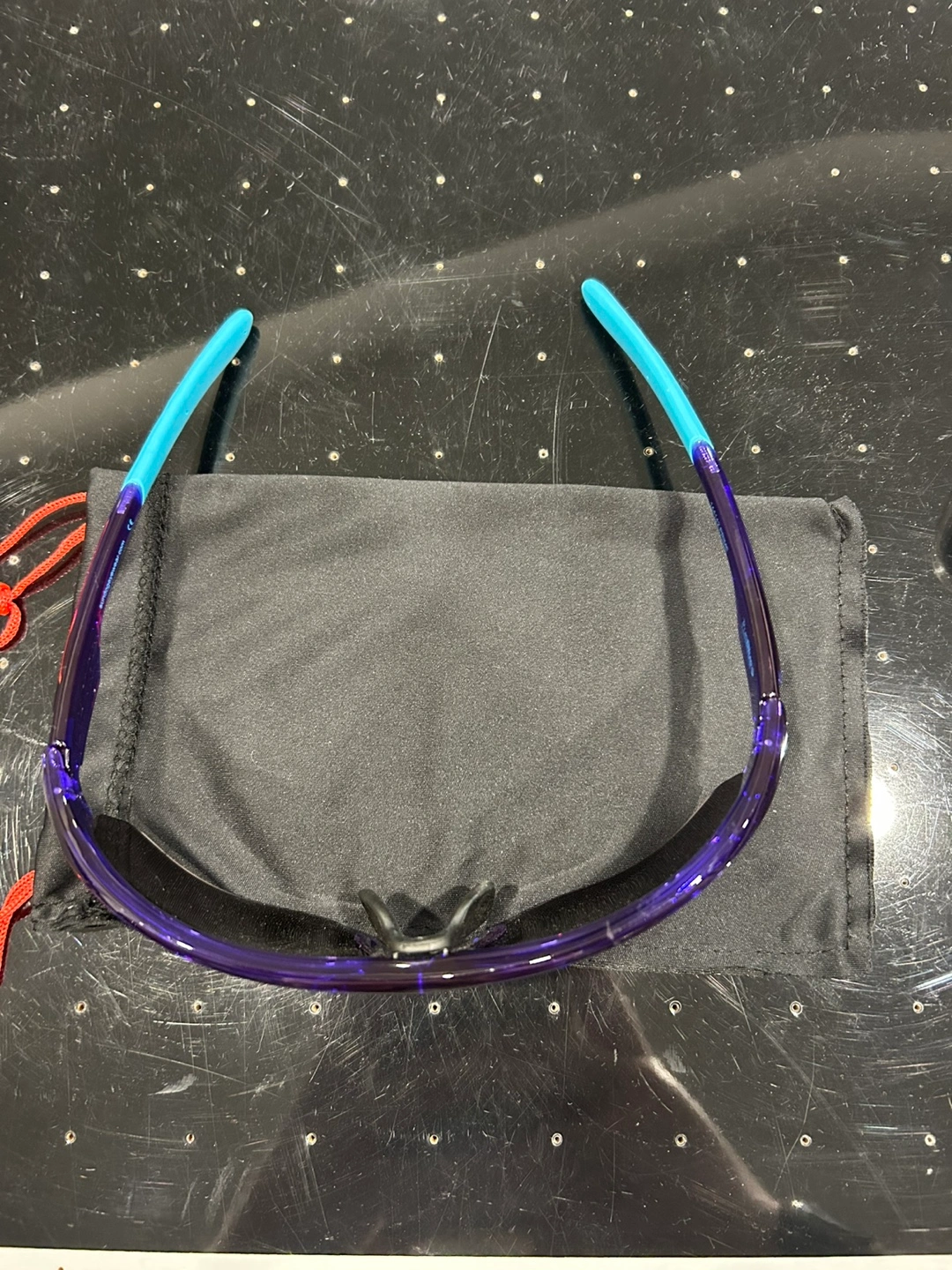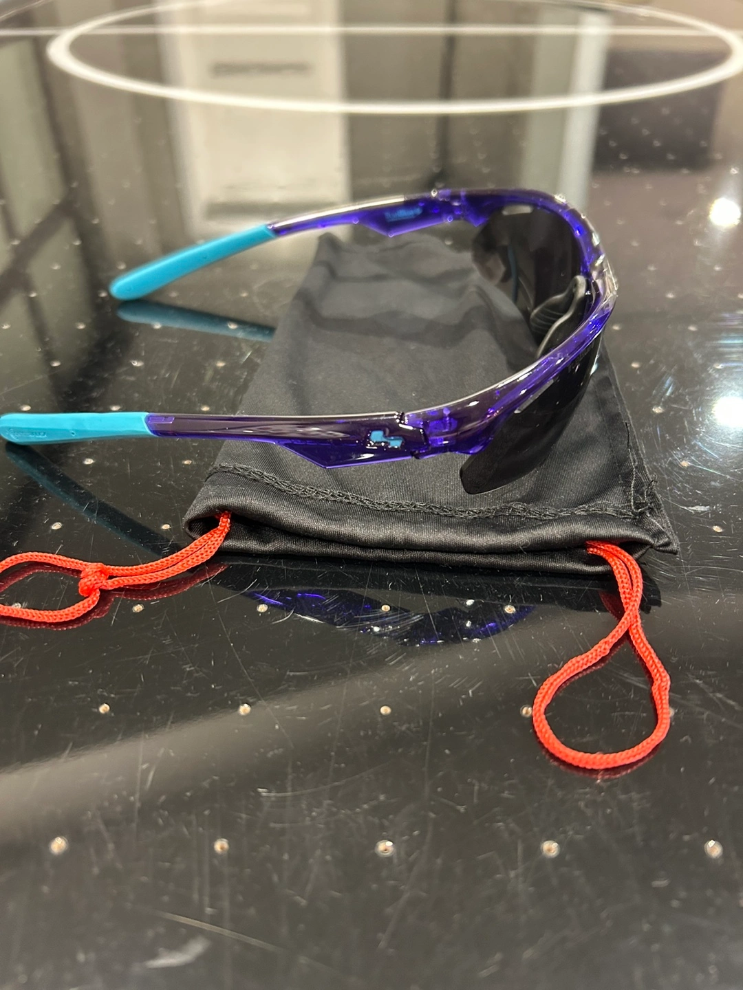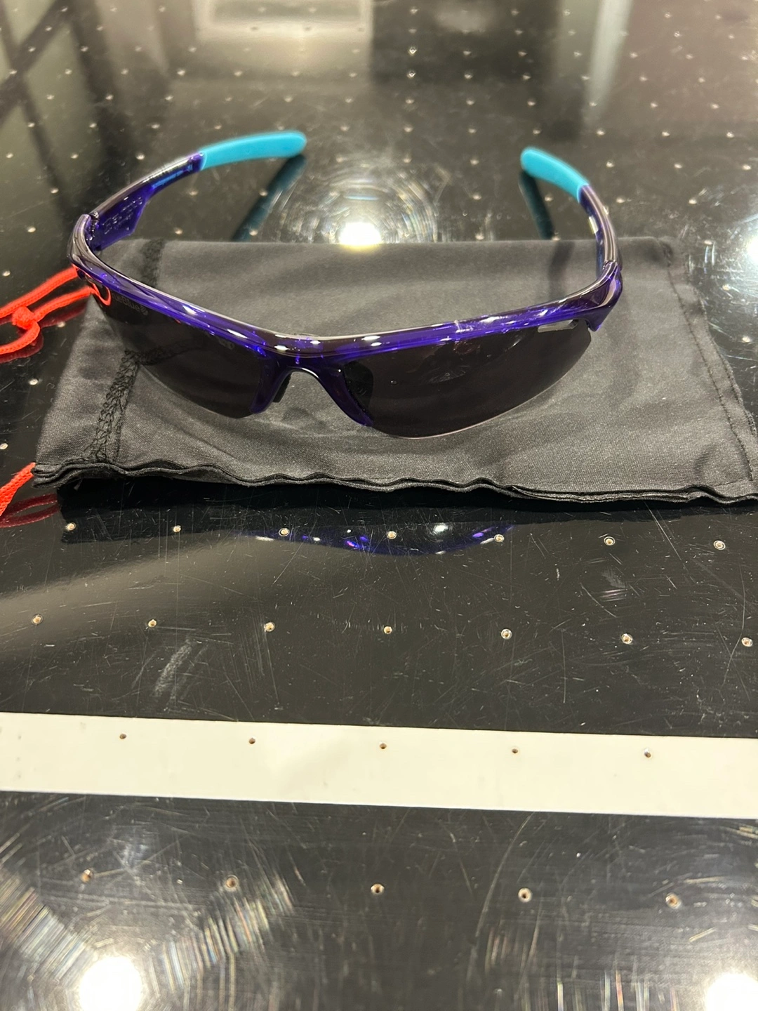 Sporty sunglasses, purple frames, teal accents. Includes a soft carrying case. Great for outdoor activities.