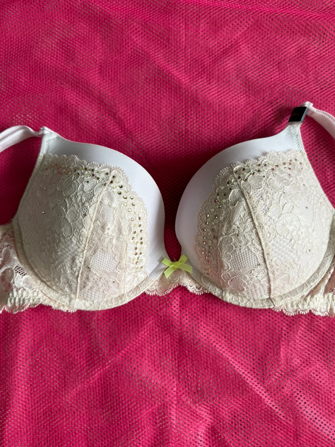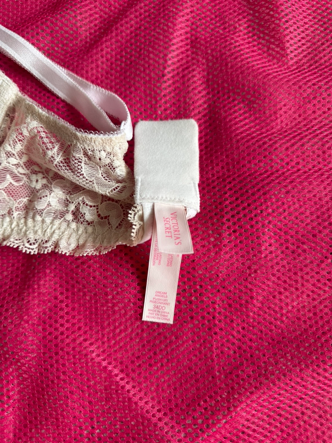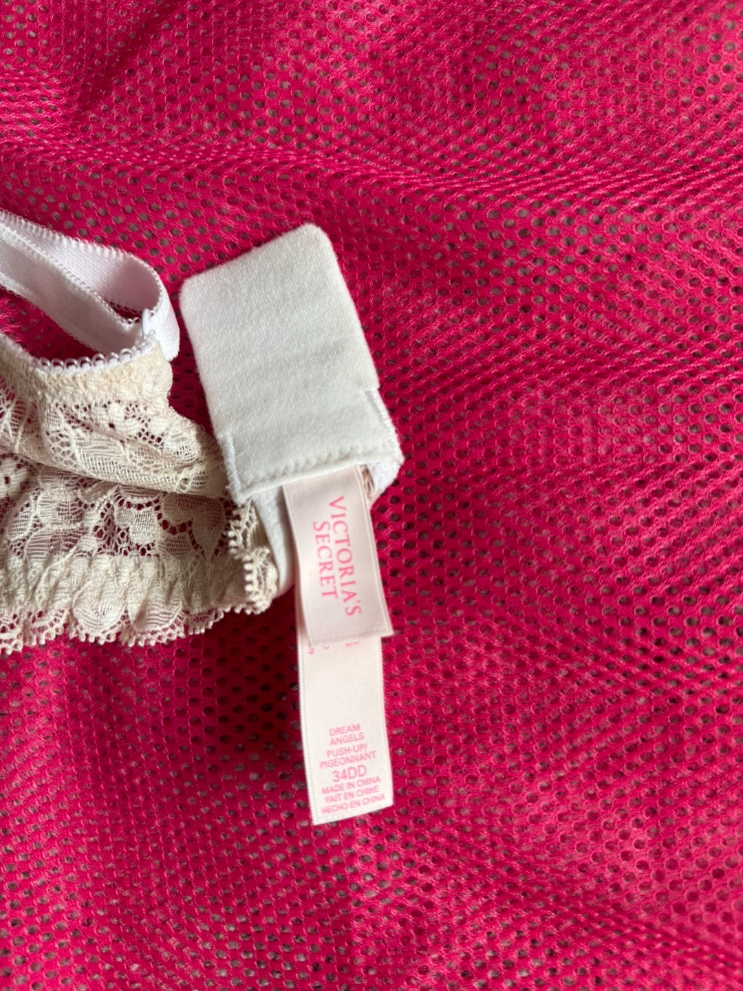 MEETING LOCATION: Scarborough Town Centre Mall only Victoria's Secret Dream Angels Push-Up Bra ***Size 34DD ***Light-padding ***Moderate Push-up style (see info. tag) ***Featuring a delicate lace detailing and subtle rhinestone embellishments ***Romantic detailing ***Nylon/Elastane: it’s designed for comfort and a flattering lift ideal for everyday wear! CONDITION: Excellent! New with original size/brand tag still attached on the strap (see photo#3,8) Colour: Pale beige/pink