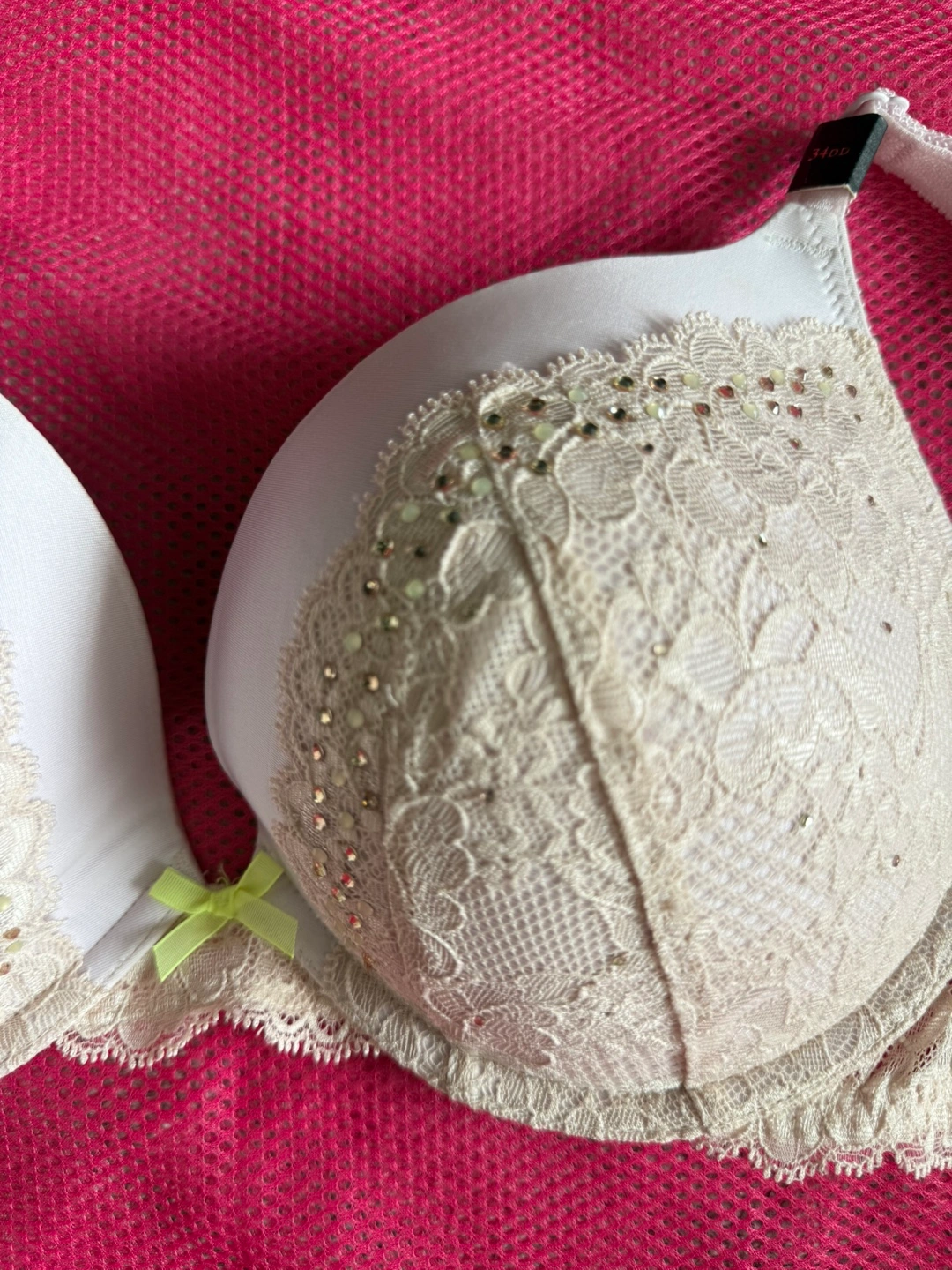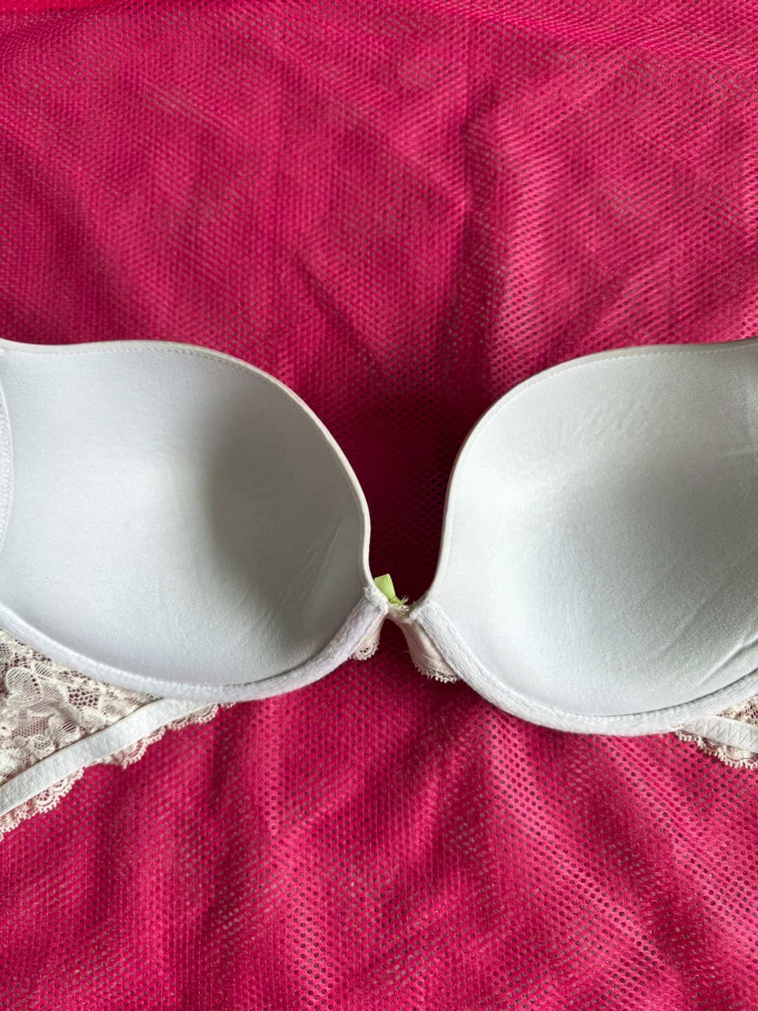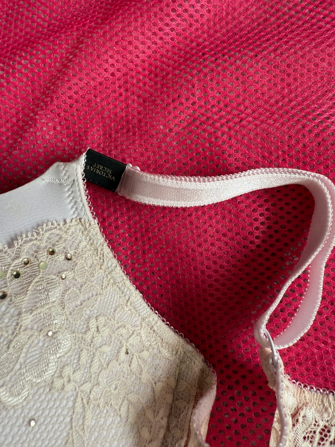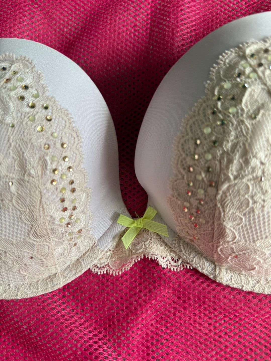 MEETING LOCATION: Scarborough Town Centre Mall only Victoria's Secret Dream Angels Push-Up Bra ***Size 34DD ***Light-padding ***Moderate Push-up style (see info. tag) ***Featuring a delicate lace detailing and subtle rhinestone embellishments ***Romantic detailing ***Nylon/Elastane: it’s designed for comfort and a flattering lift ideal for everyday wear! CONDITION: Excellent! New with original size/brand tag still attached on the strap (see photo#3,8) Colour: Pale beige/pink