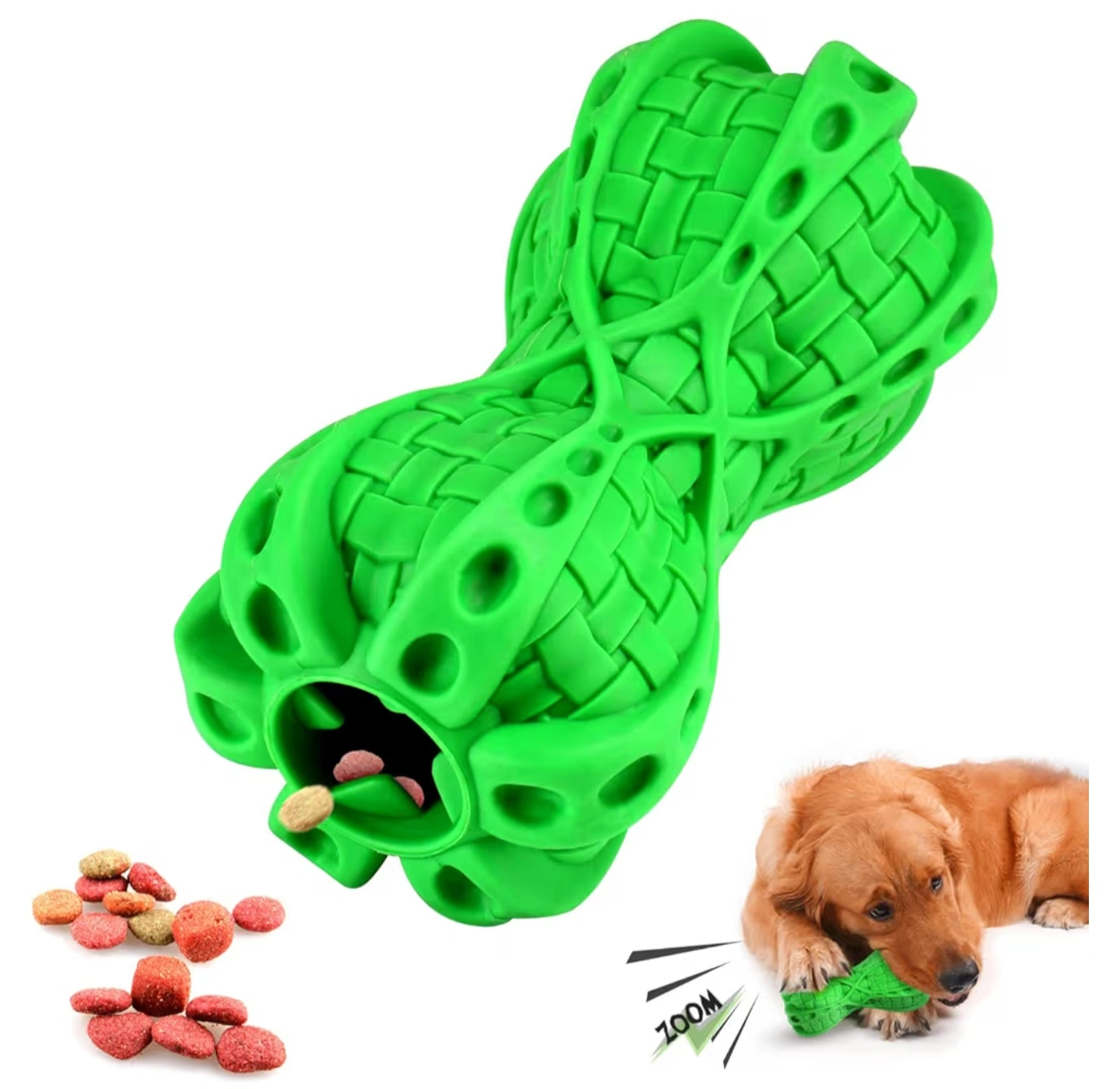 Green rubber dog chew toy. Designed for aggressive chewers. Suitable for medium and large breeds (15-80 lbs). Features a unique tooth cleaning design to reduce plaque and tartar. Squeaking device inside. Measures approximately 6.1 inches long and 3.4 inches high.