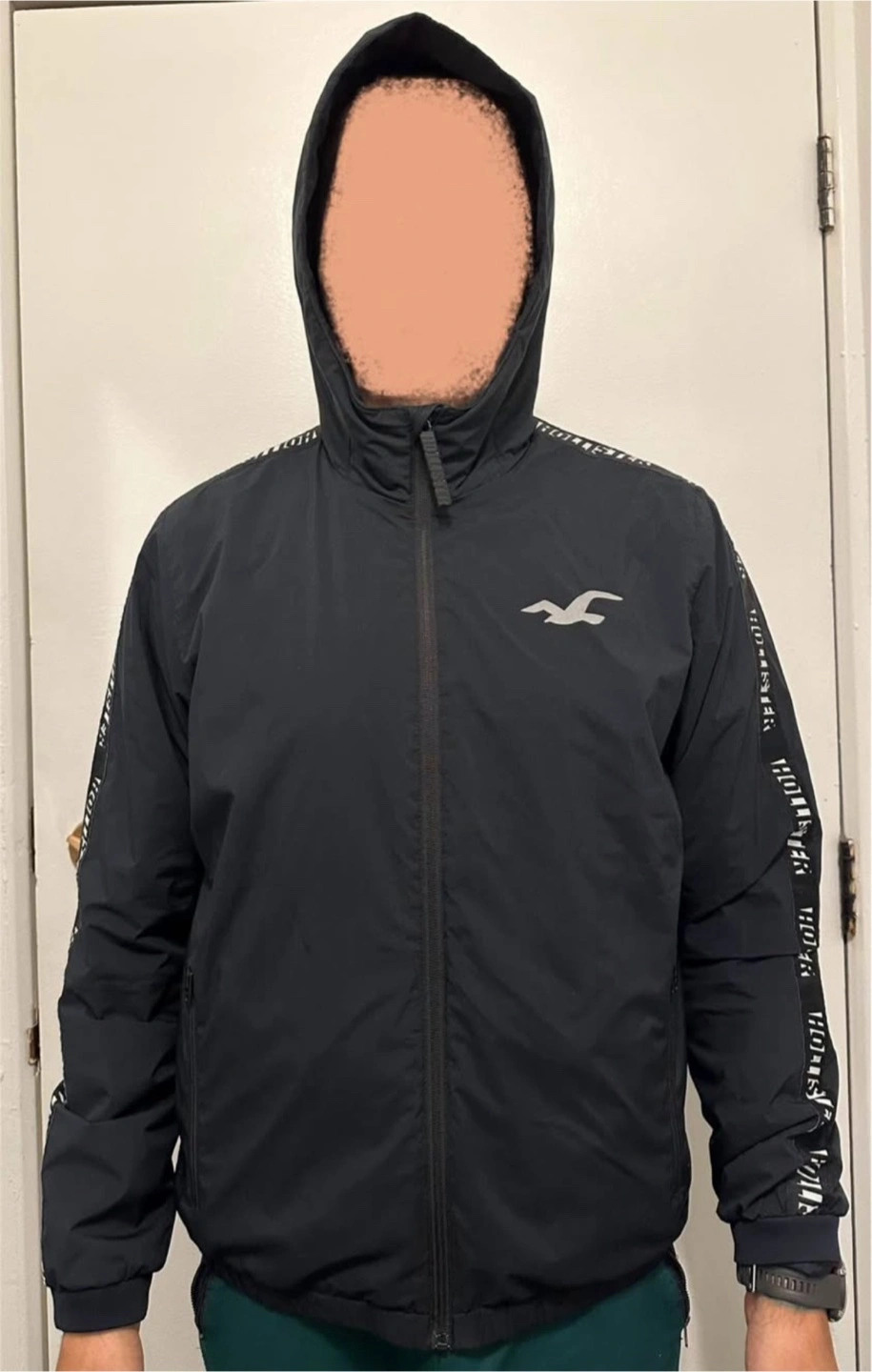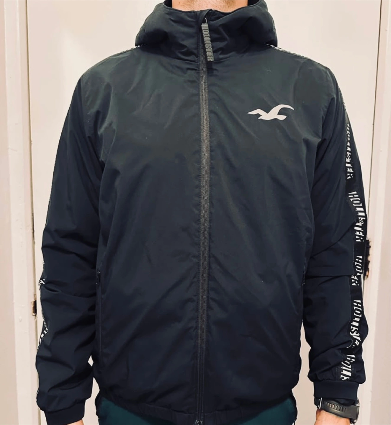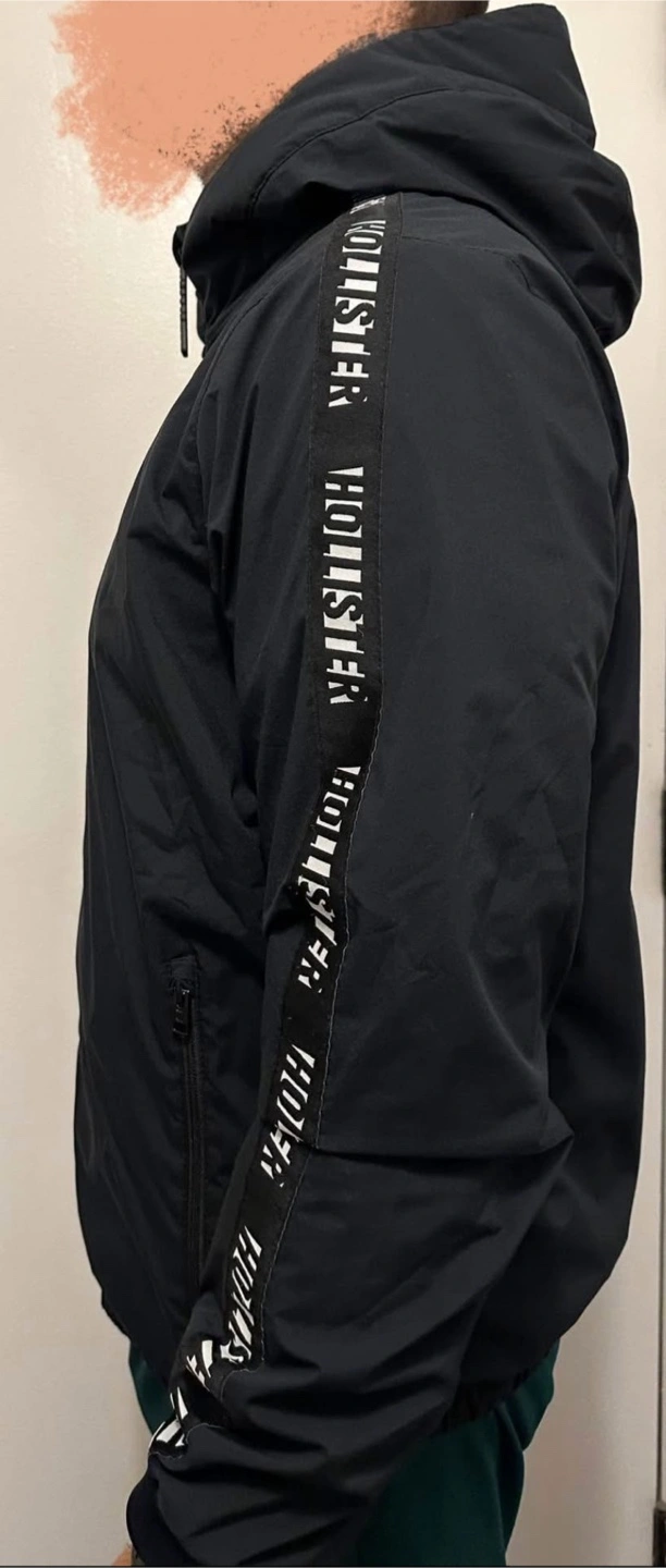 Men's black zip-up jacket. Features a hood and side pockets. Size large. Hollister California branding