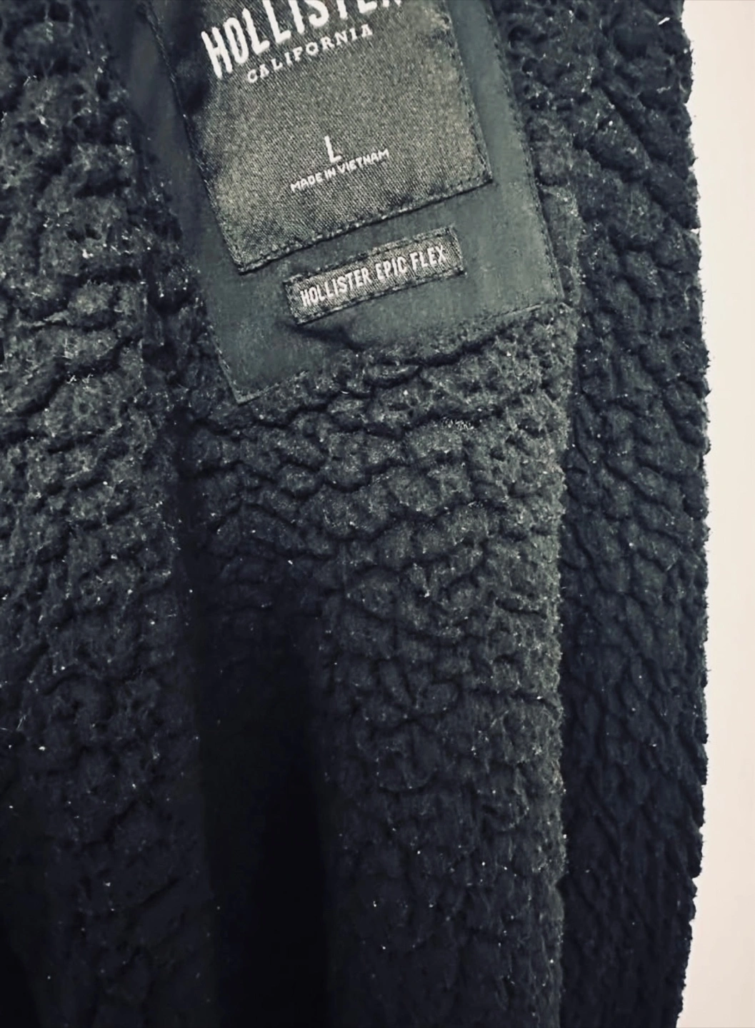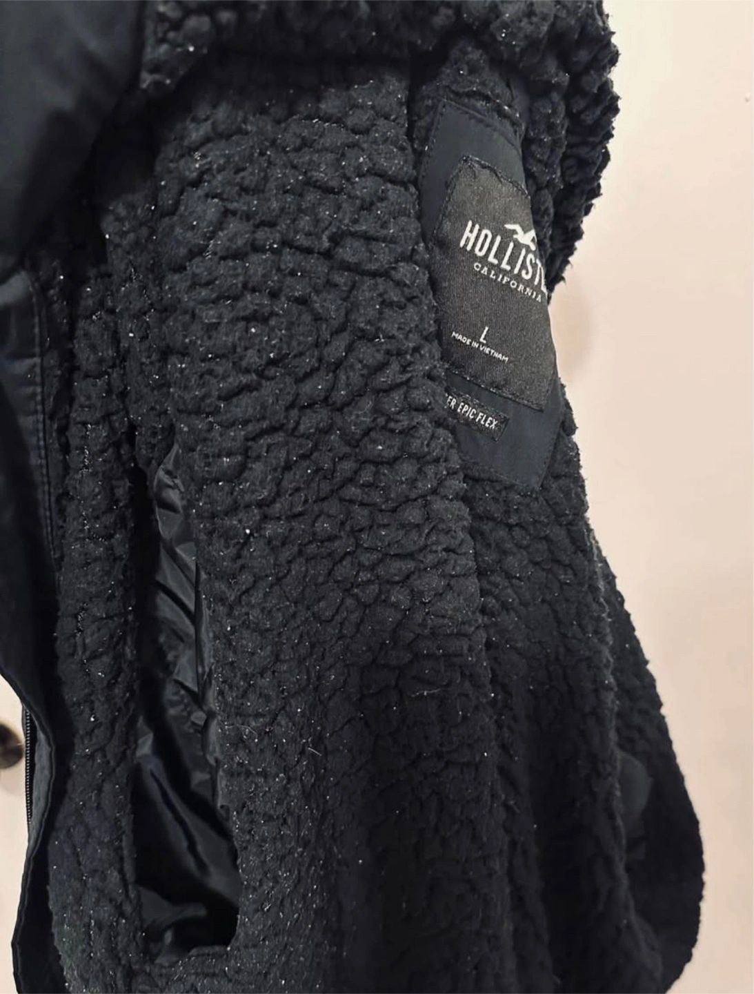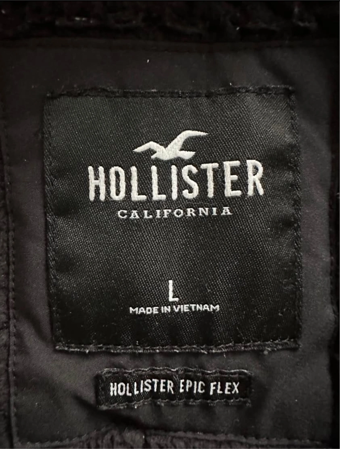 Men's black zip-up jacket. Features a hood and side pockets. Size large. Hollister California branding