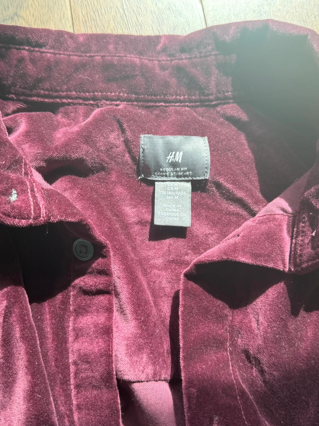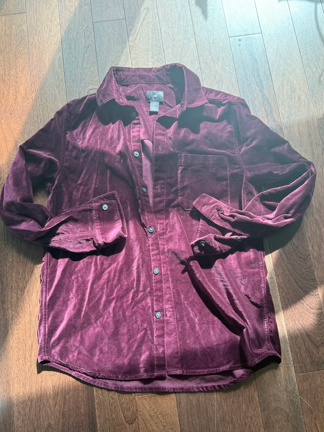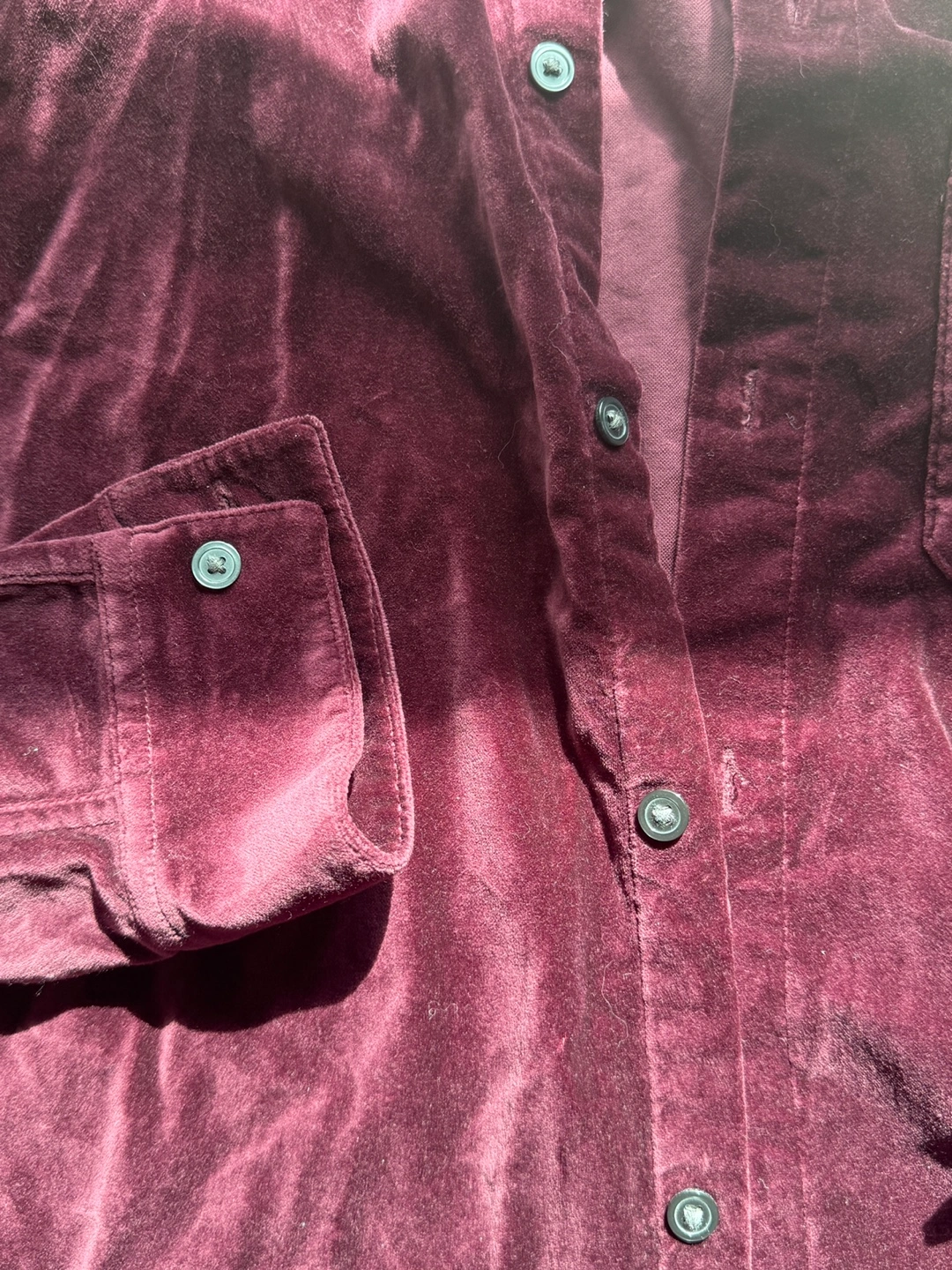 Long-sleeve button-down shirt. Maroon velvet material. Button closure. Chest pocket. Size medium. Never Worn. Brand New.