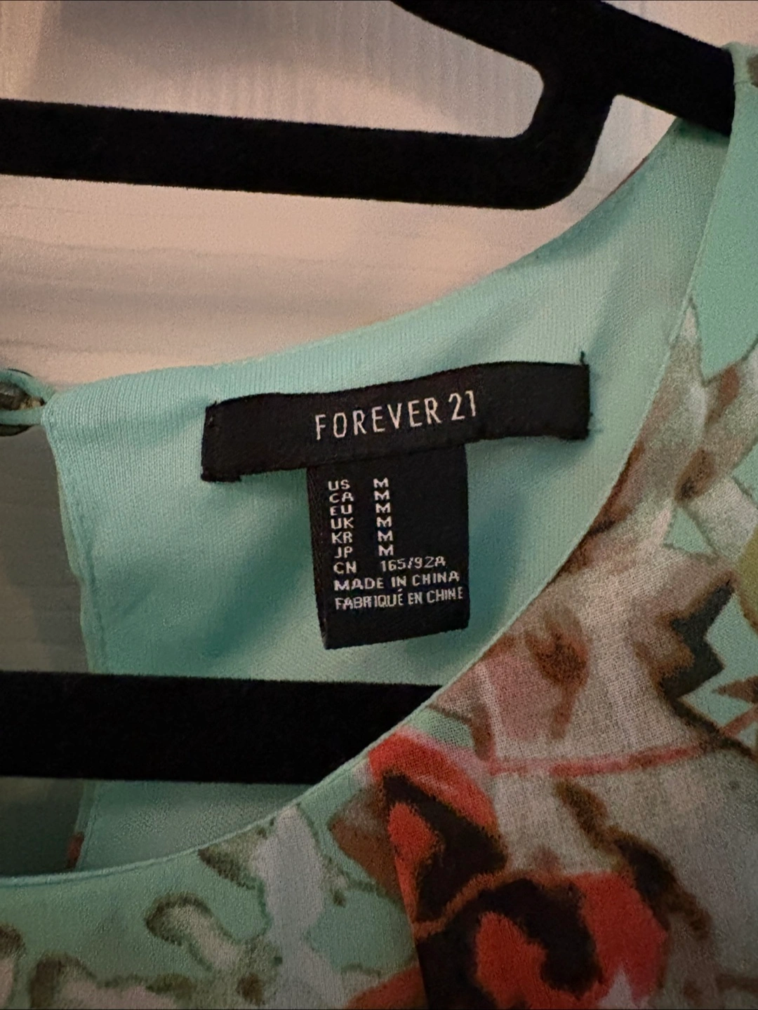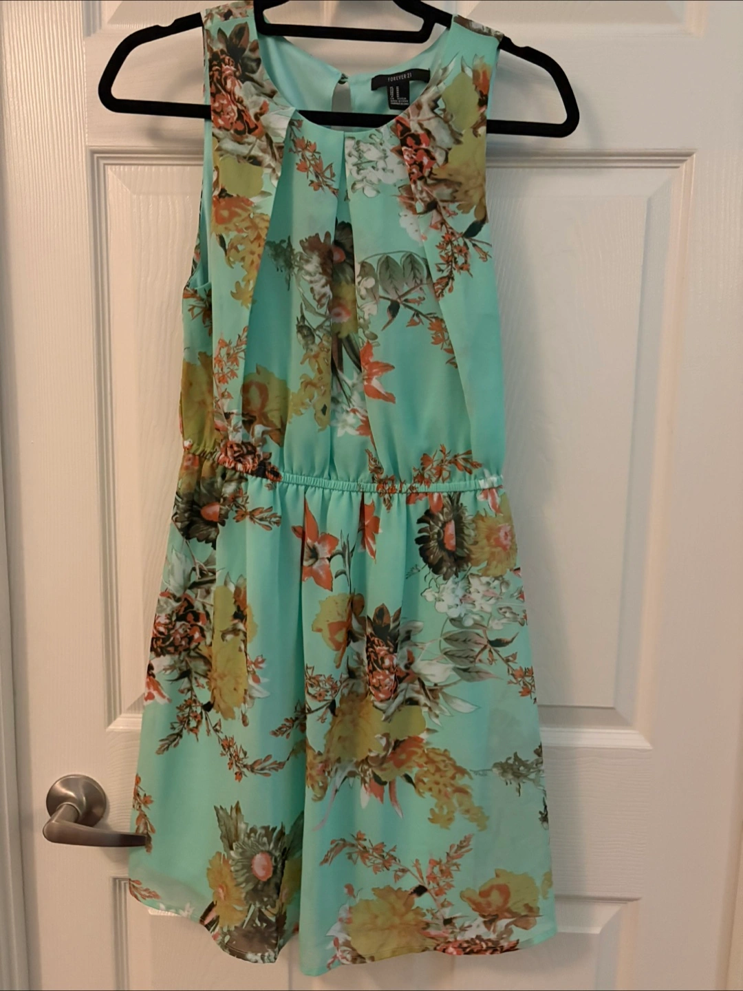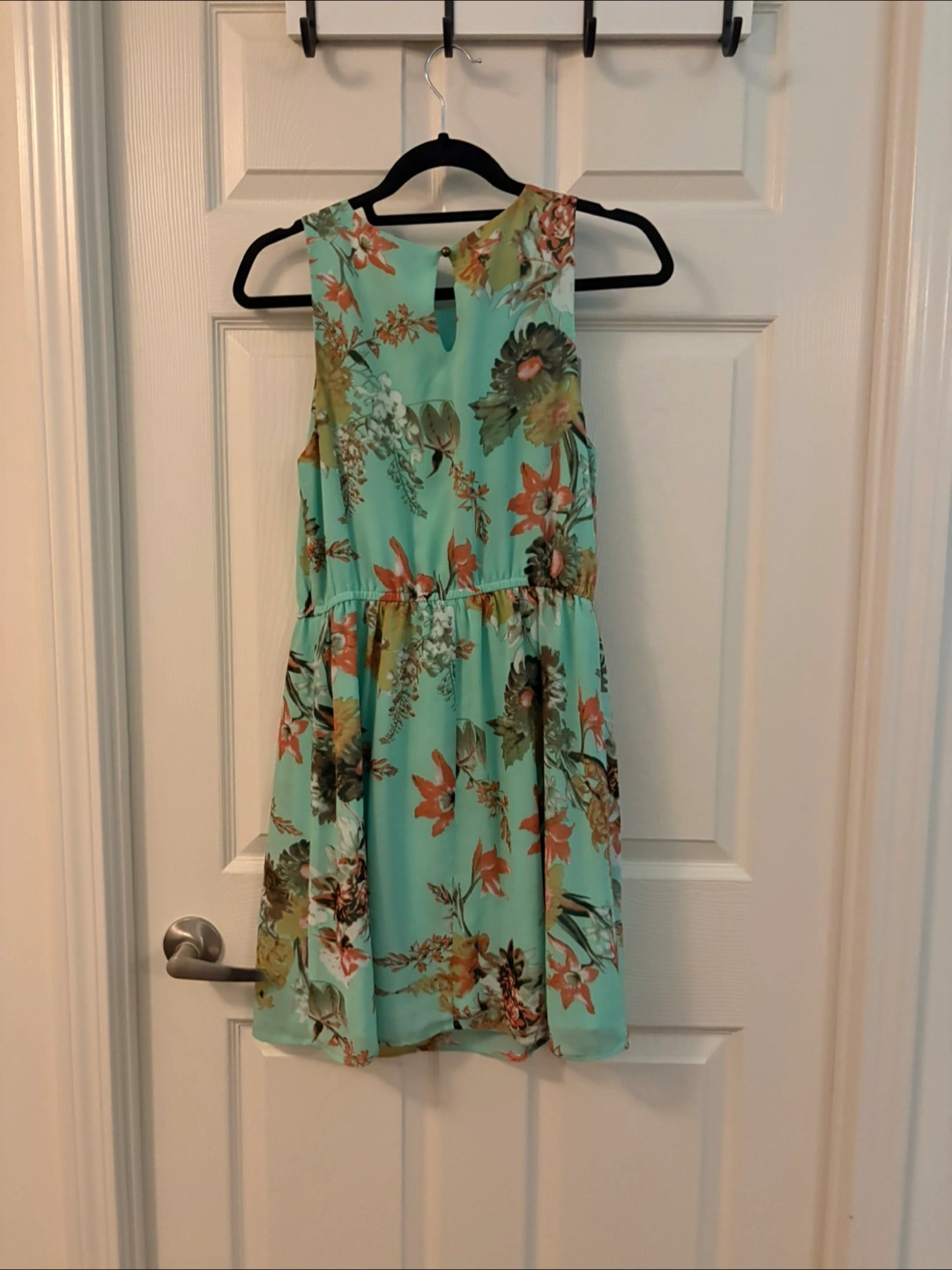 Cute floral mini dress. Size medium. Mint green colour base. Sleeveless. Back zipper. Flowy material. Worn twice. Comes from a smoke free and pet free household. Cash only.