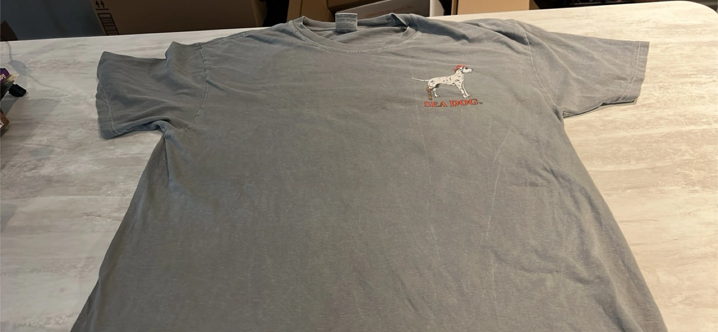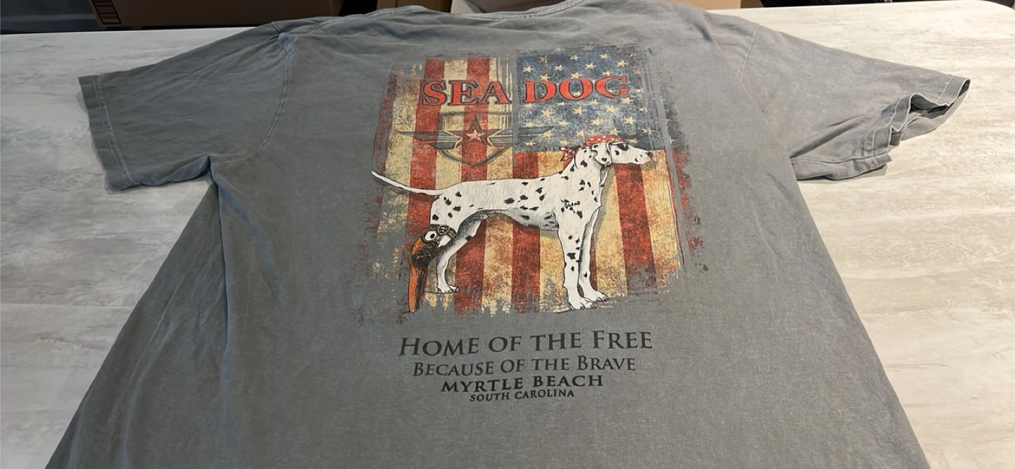 Grey short sleeve t-shirt. Features a Dalmatian graphic on the front and back. Patriotic theme. Size not specified.