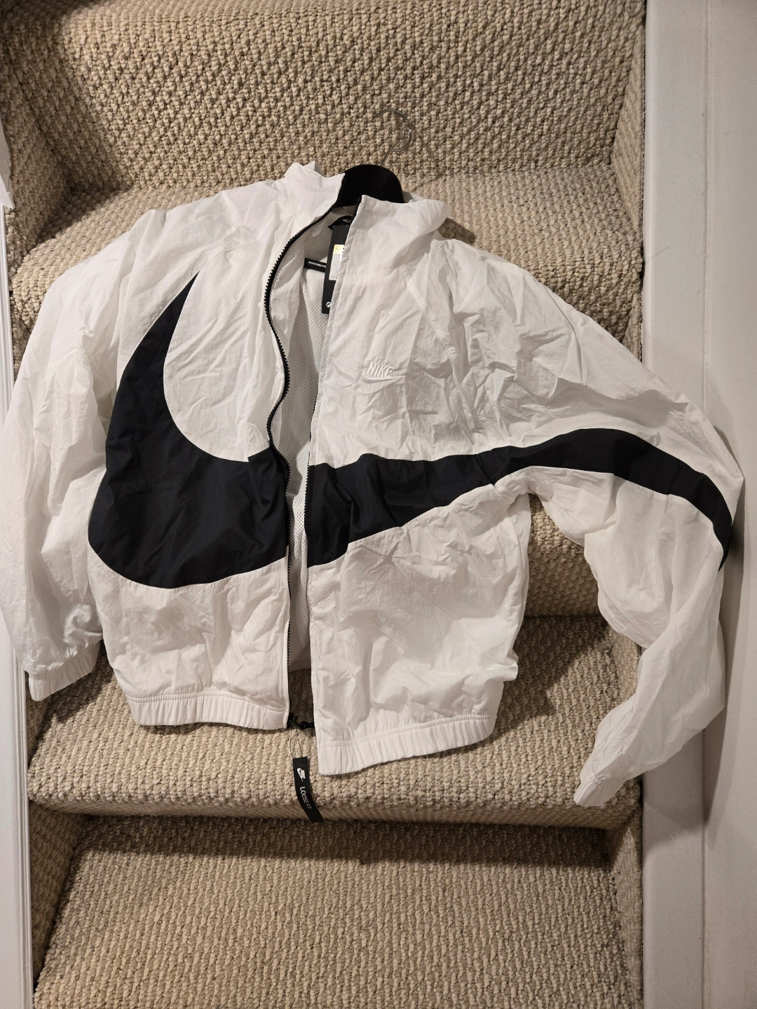 Lightweight jacket. White with large black swoosh. Full zip. Long sleeves. Great for layering. rare jacket with tag
