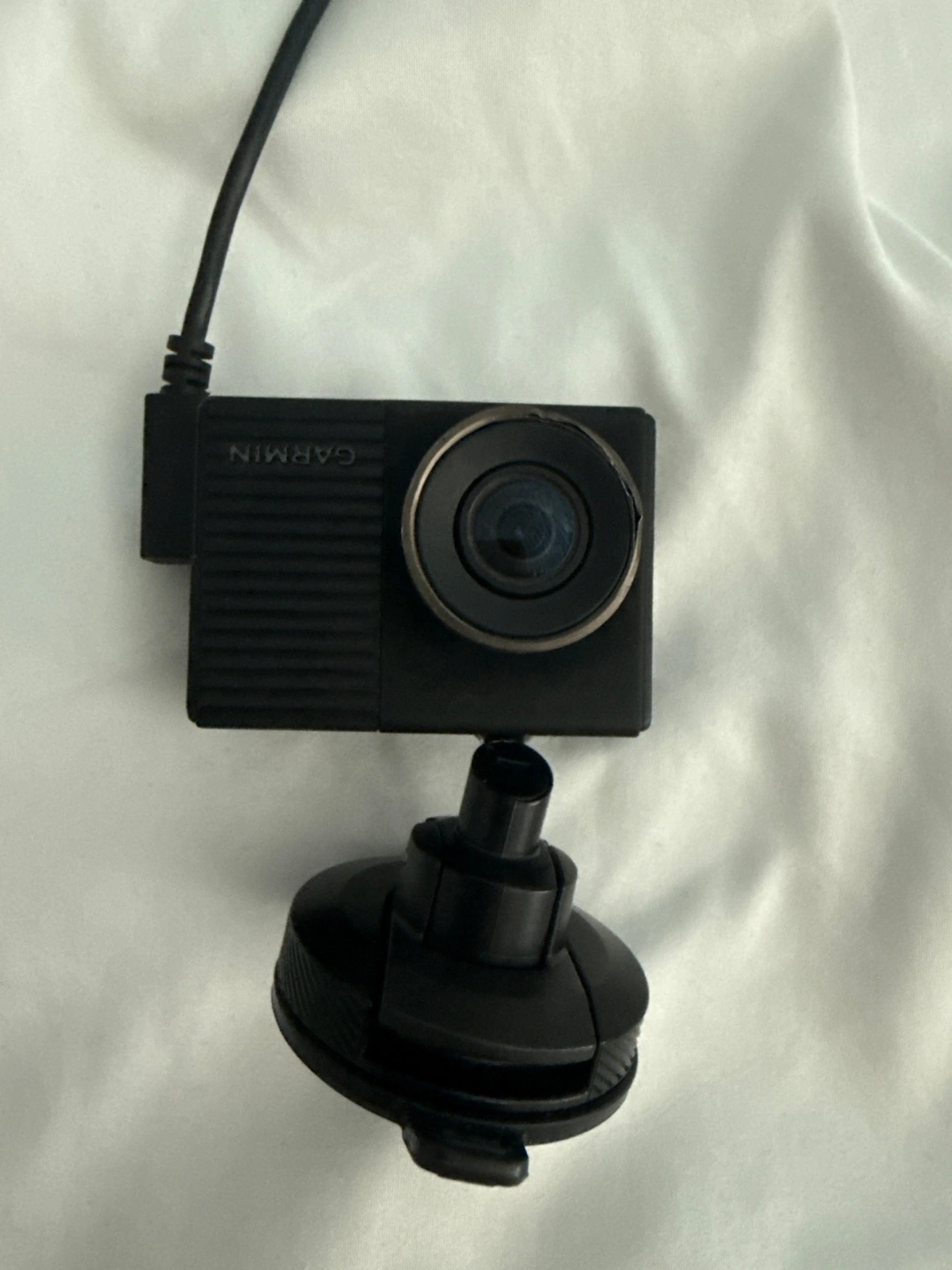 Compact dash cam. Records driving footage. Includes suction cup mount. Good condition. Compact, discreet dash cam with wide 140-degree field of view captures crisp 1440p footage and Garmin Clarity HDR™ provides increased detail in low-light situations · Automatically records and saves footage of incidents · Dash Cam Auto Sync enables you to control and play back footage from up to four cameras on your smartphone using the GarminDrive™ app · Voice control (available for English, French, Italian, Spanish, German and Swedish) allows you to easily save a video or picture, start/stop audio recording or start/stop the Travelapse™ video capture feature · Driver alerts include forward collision, lane departure warnings (certain conditions may impair the waring function) and “Go” alerts to enhance driver awareness Cash only