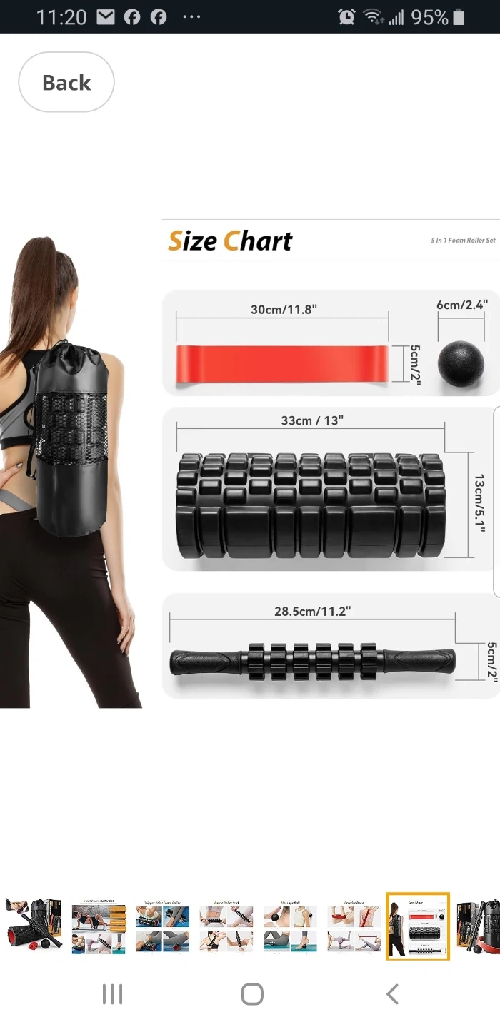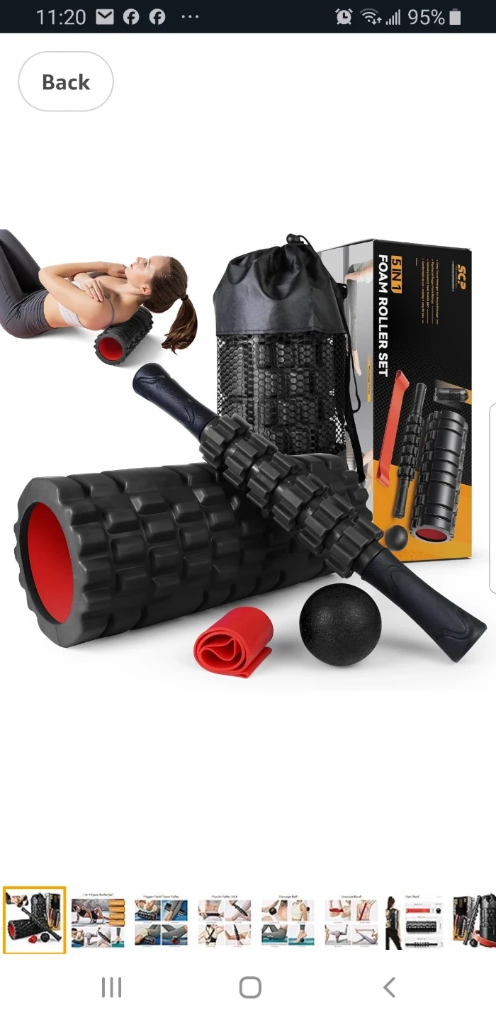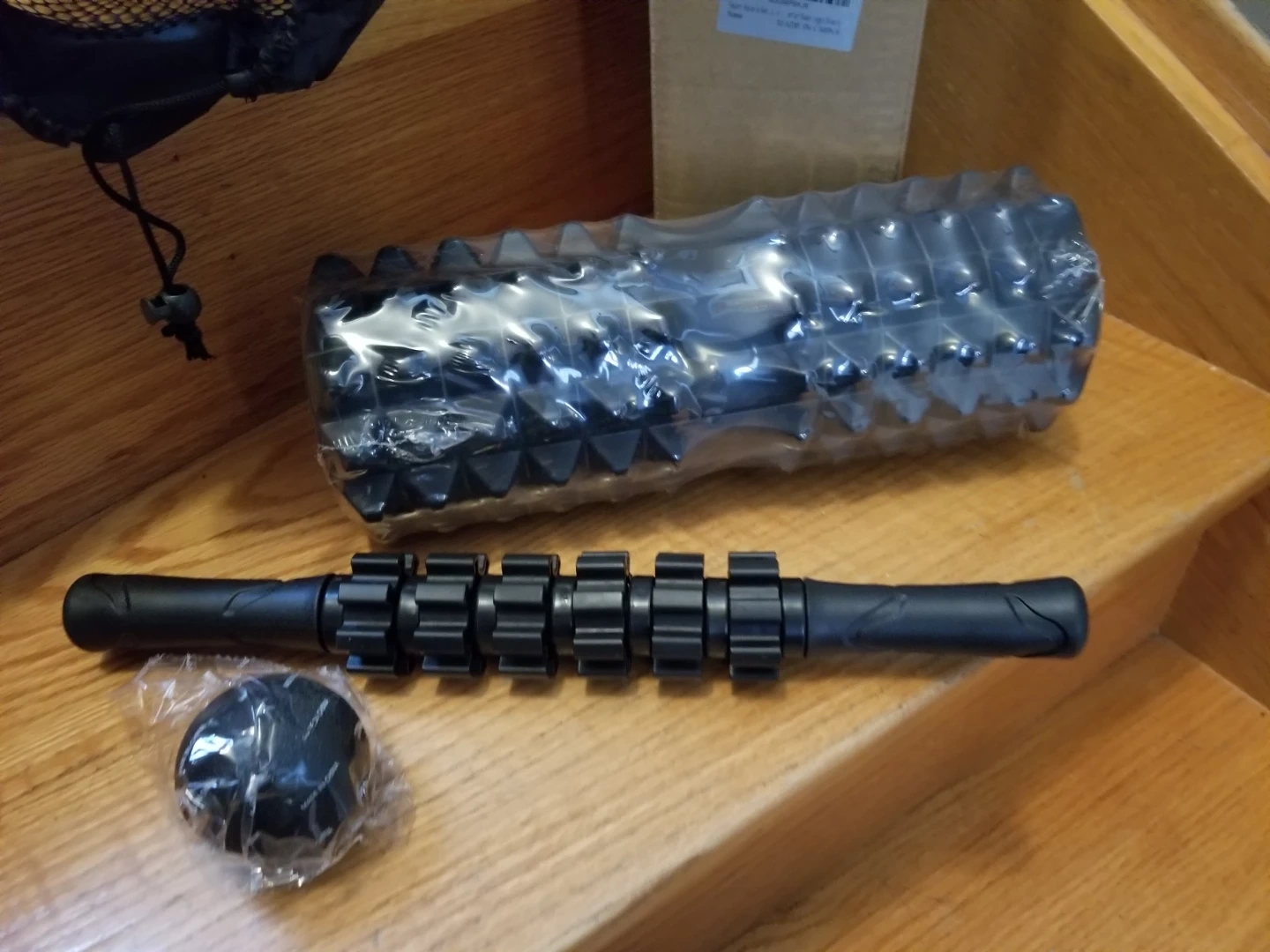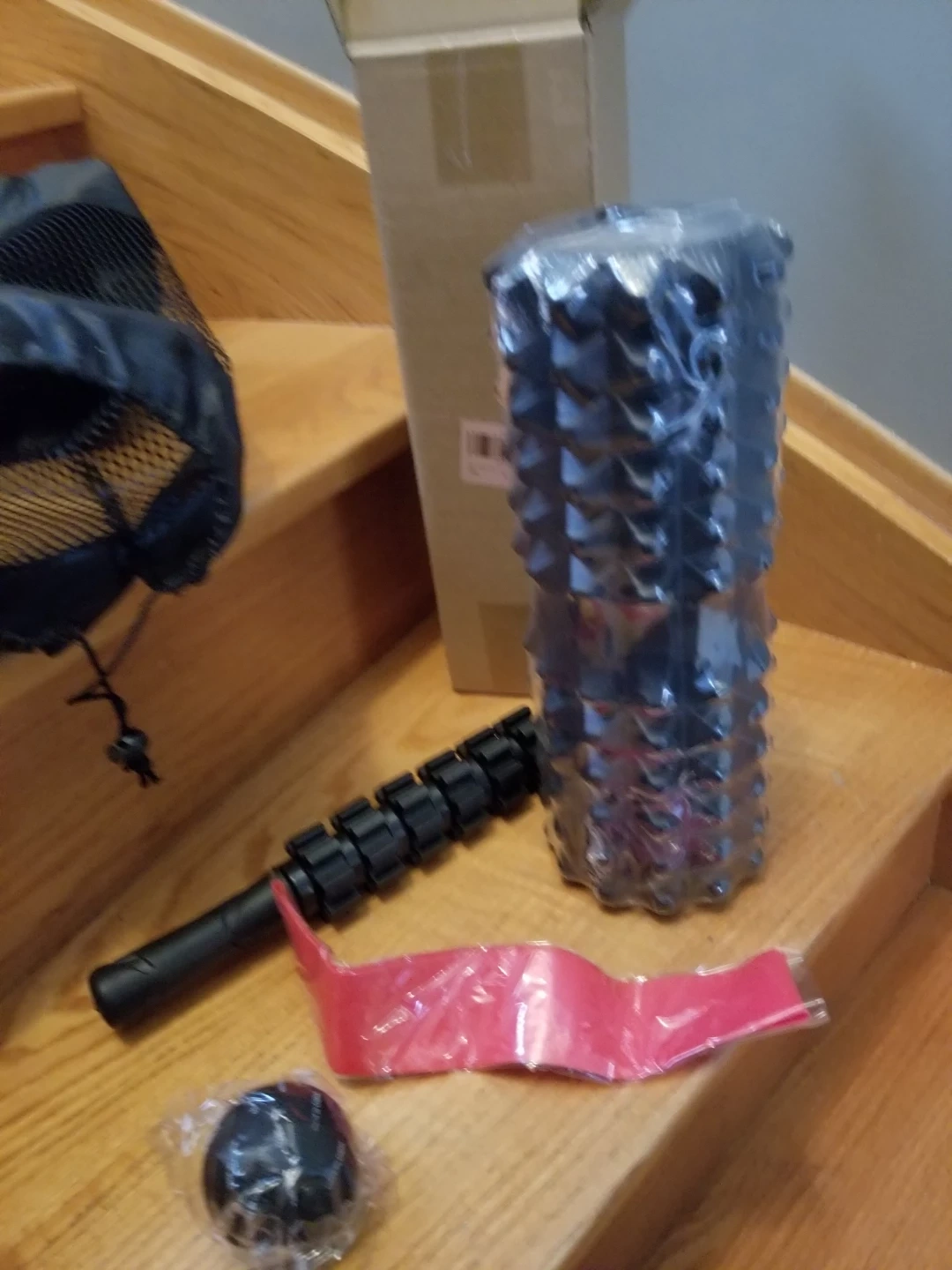 Five-piece foam roller set. Includes foam roller, massage stick, and massage ball. Great for muscle recovery and relieving soreness. Improves posture and promotes whole-body relaxation.