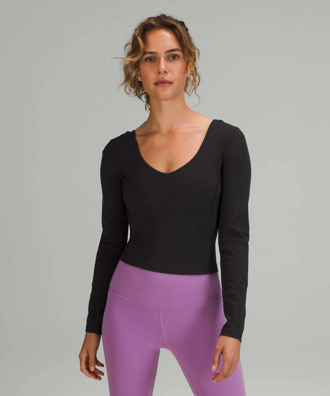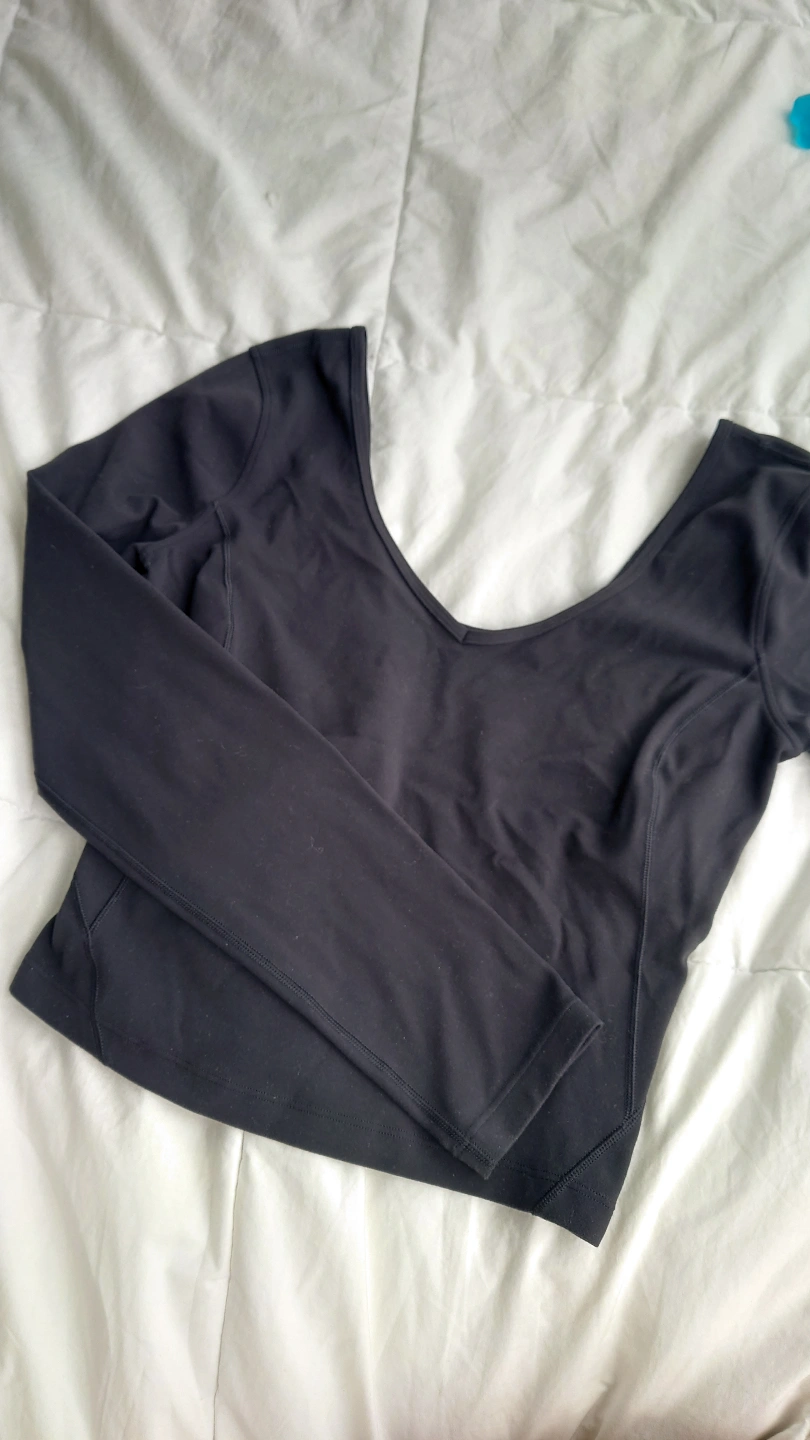 Black long-sleeve fitted top. Scoop neckline. Great for layering or wearing alone. Soft and stretchy material.