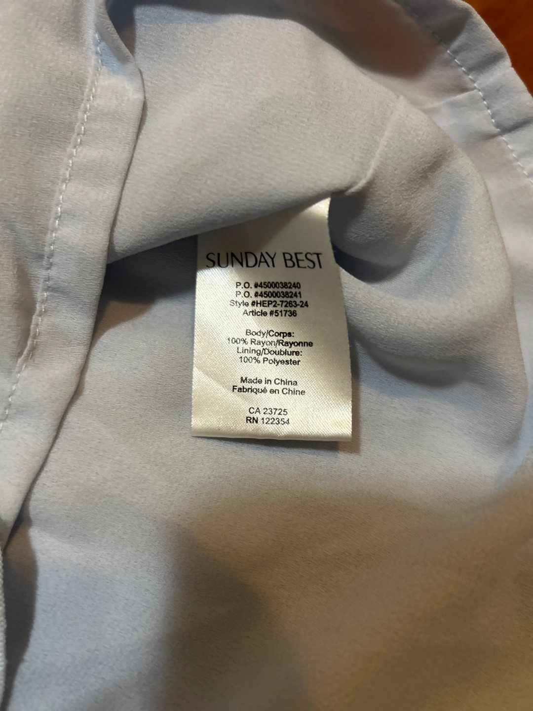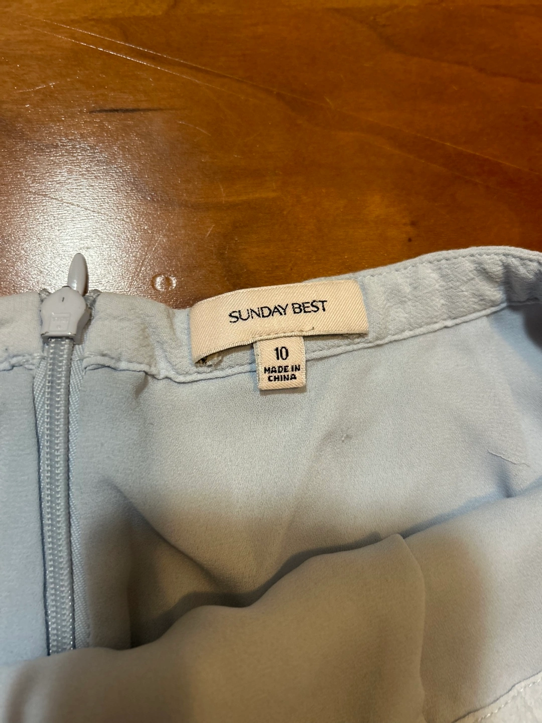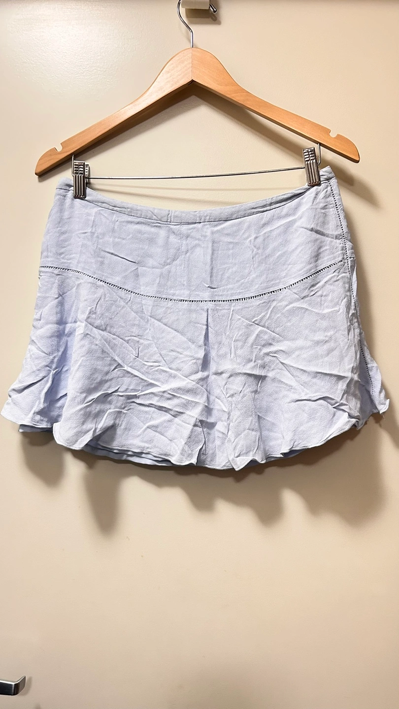 Cute light blue mini skirt. Size 10. Rayon and polyester. Zipper closure. Scalloped hem.