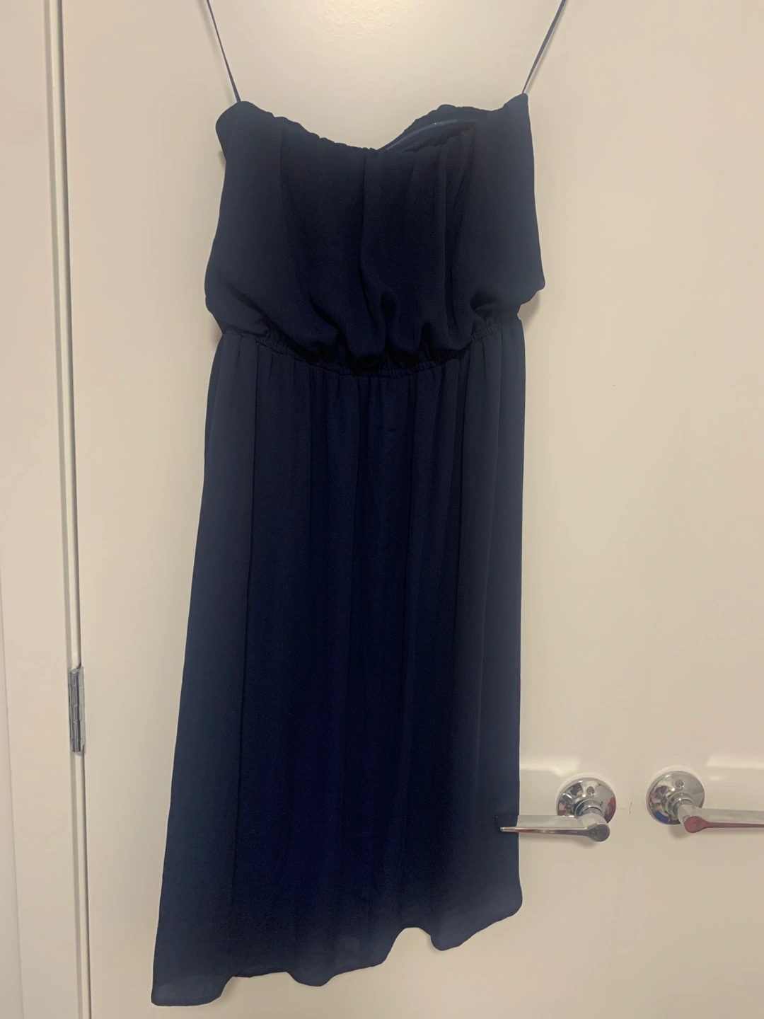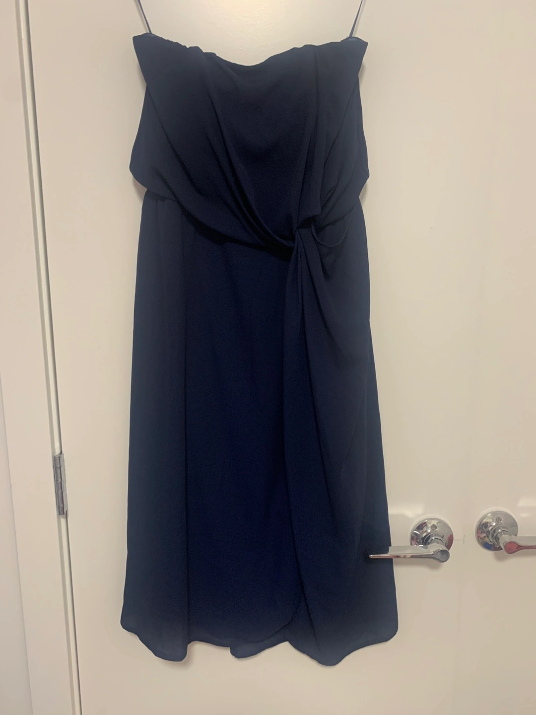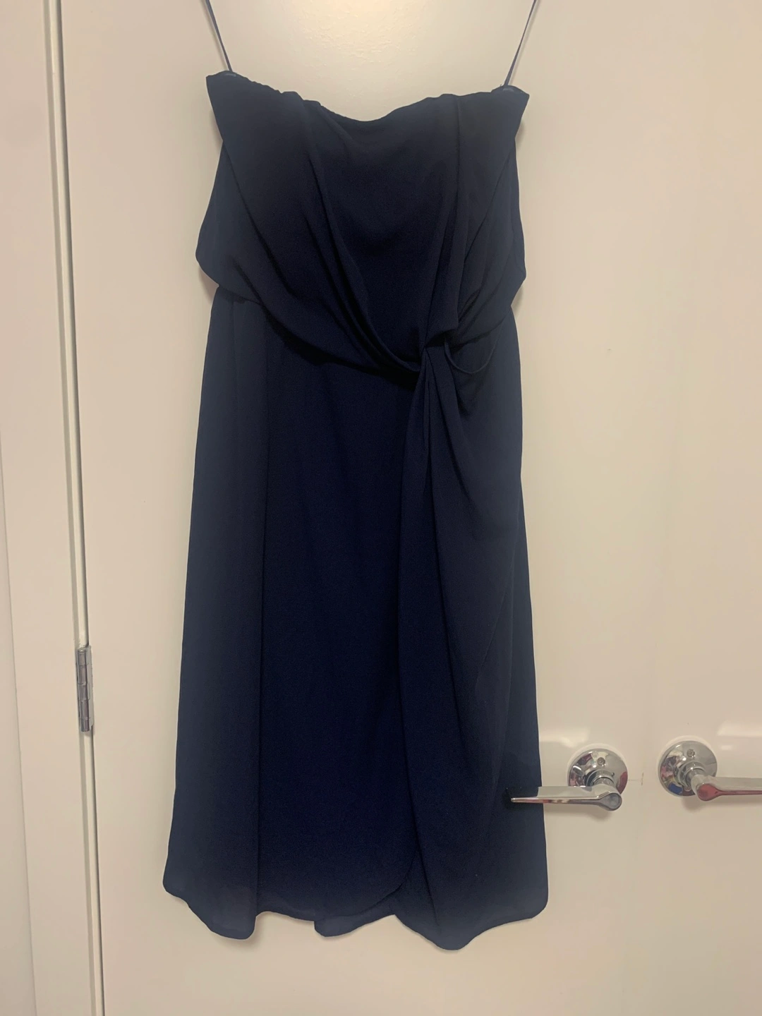 Beautiful navy blue mini dress. Strapless with a twisted detail at the waist. Size 6. Polyester.