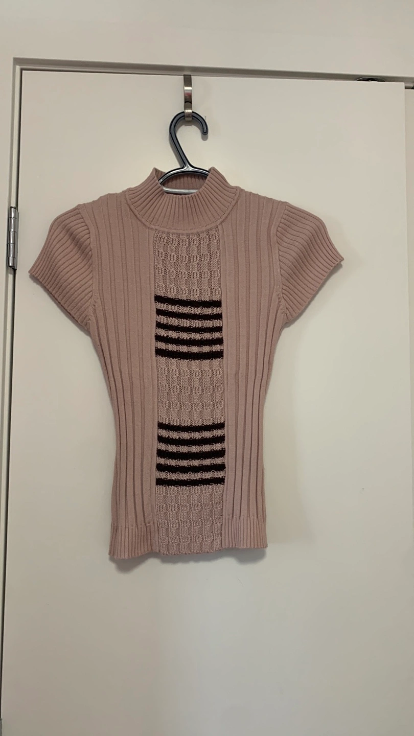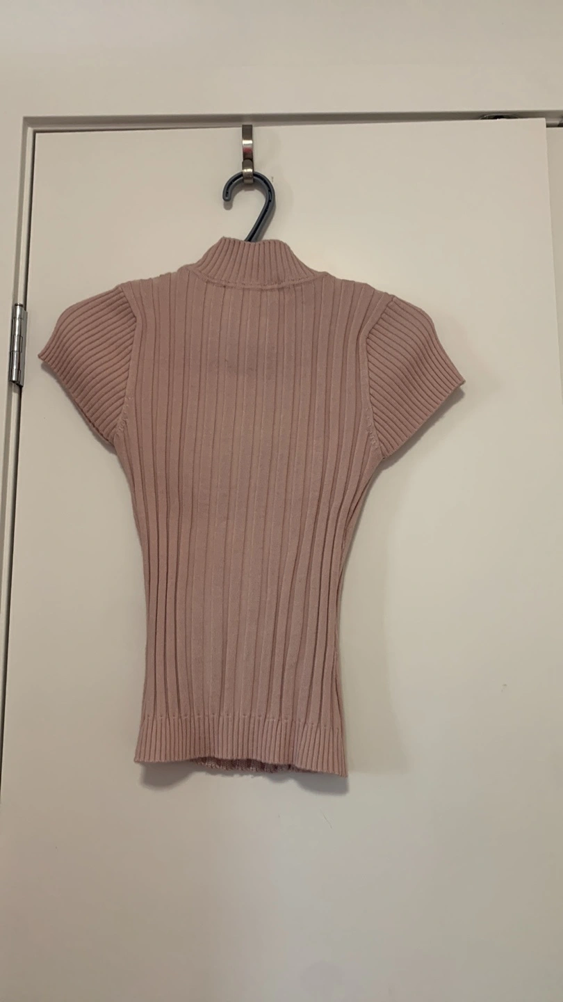 Dusty rose short sleeve mock neck top. Ribbed knit fabric. Features a textured panel down the centre front. Great for layering or wearing alone.