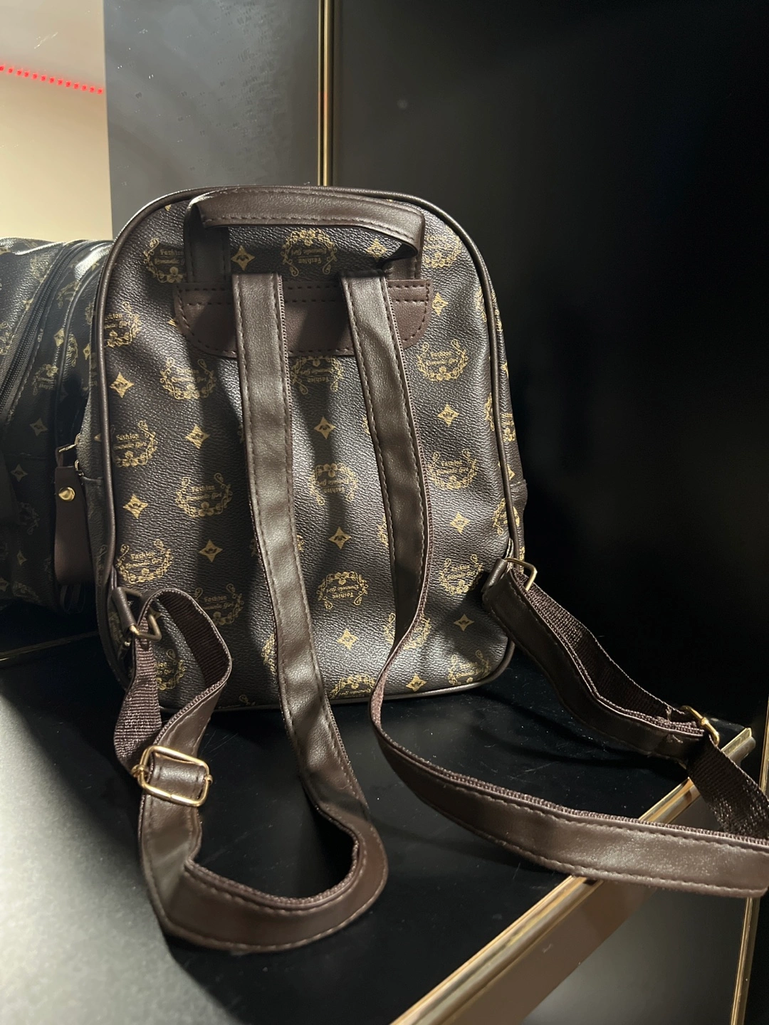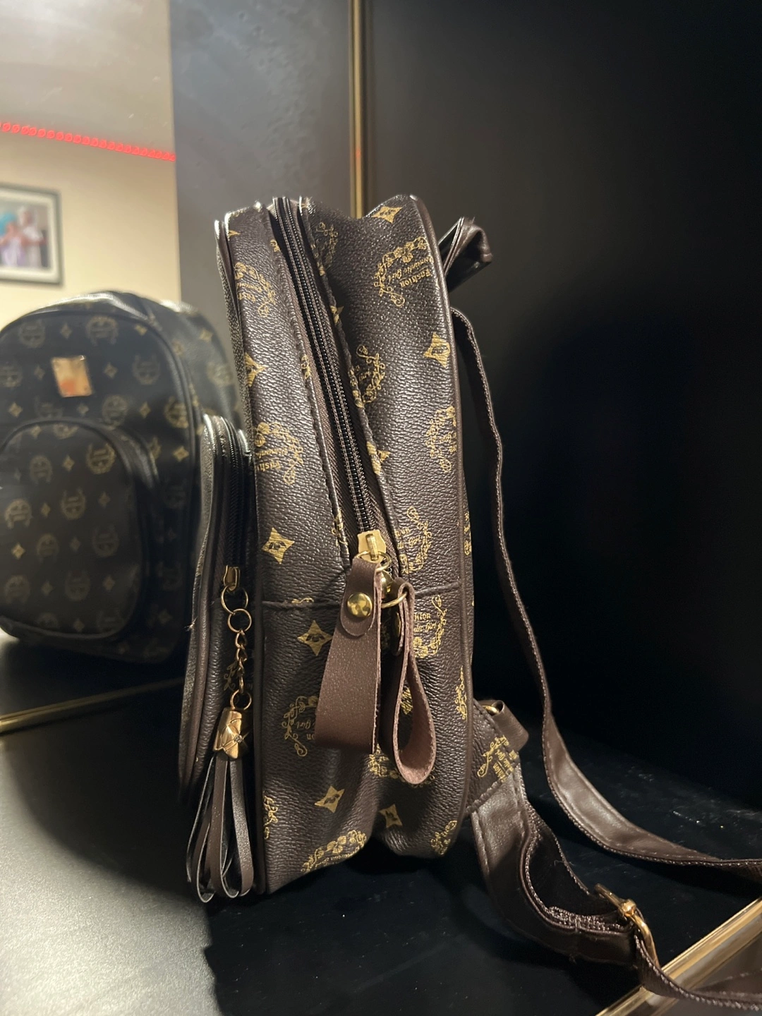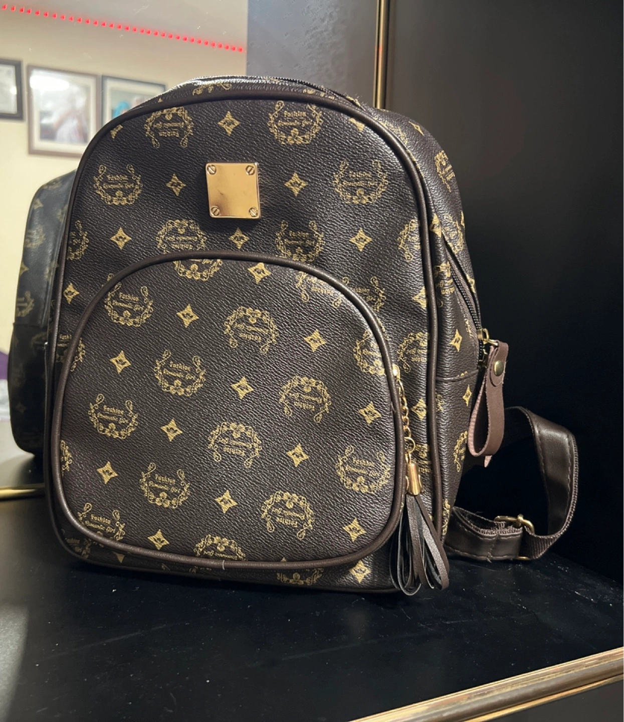 ❣️Got it for $50, just not my style❣️ Brown mini backpack. Brown faux leather. Features a gold logo pattern and tassel detail. Adjustable straps.