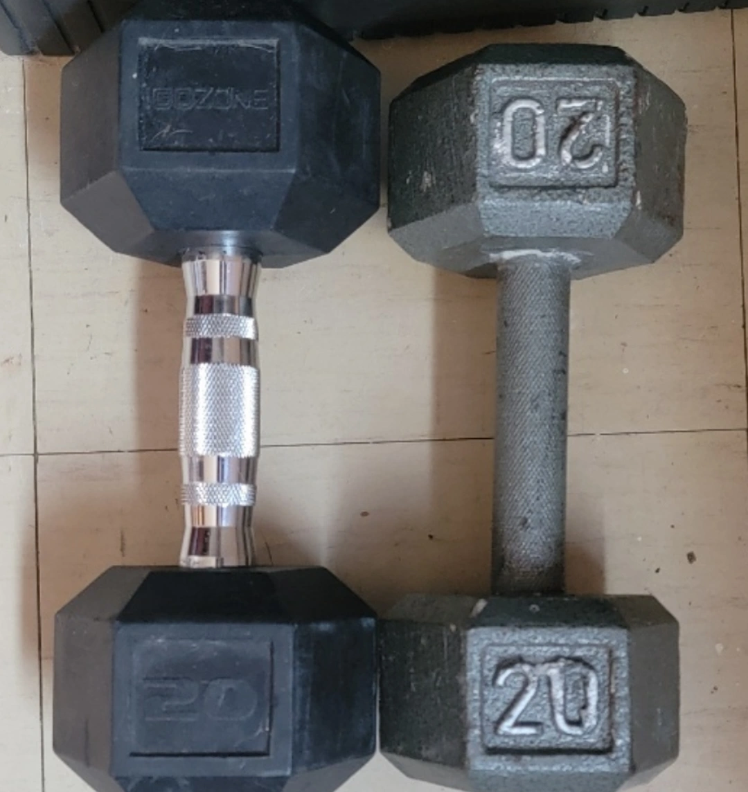 Two 20-pound hexagonal dumbbells. One black, one grey. Chrome handles. Good condition.