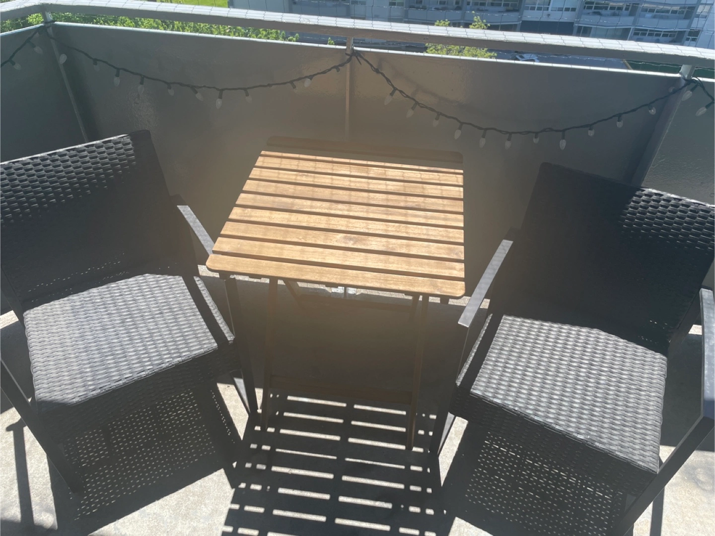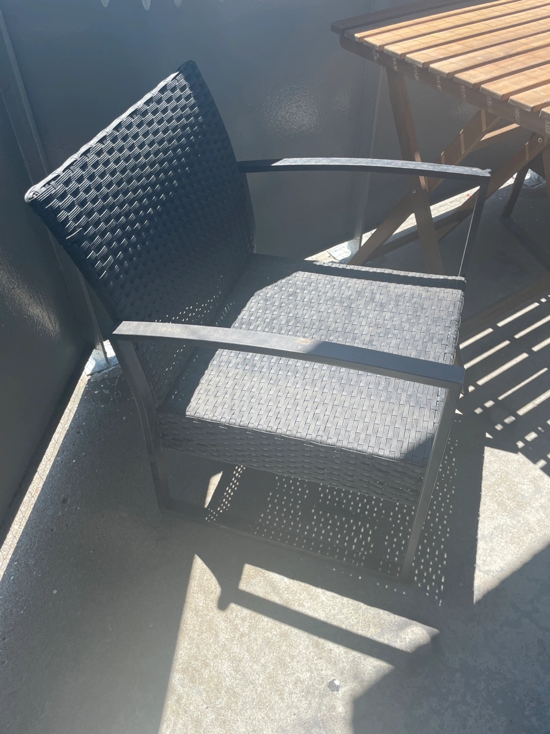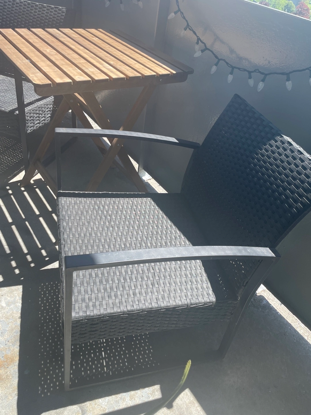 Small patio set, perfect for a balcony or small space. Includes two black resin wicker chairs with metal frames and a small square wooden table. Ideal for enjoying your morning coffee outdoors.