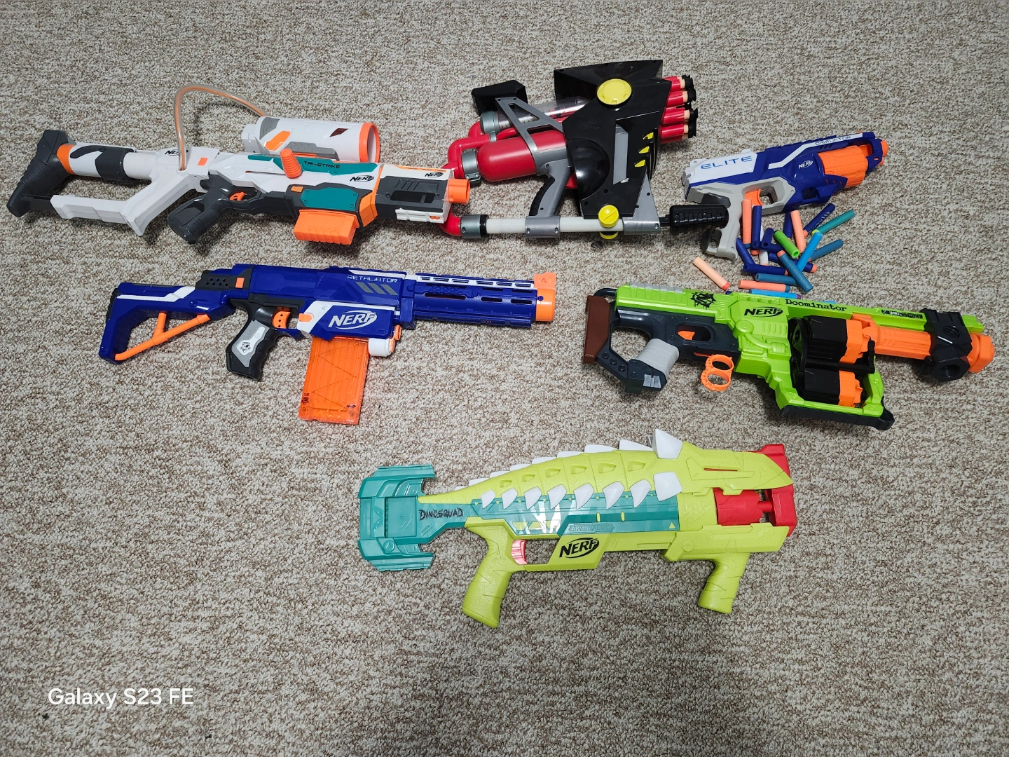 Collection of Nerf blasters. Includes Tri-Strike, Retaliator, Elite, Dominator, and DinoSquad models. Darts are included.