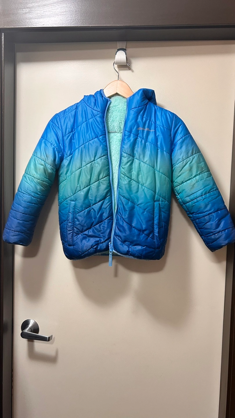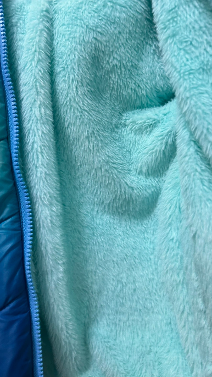 Reversible hooded puffer jacket. Features a quilted outer shell and a soft, fluffy inner lining. Ombre blue colour scheme. Great for layering during colder months.