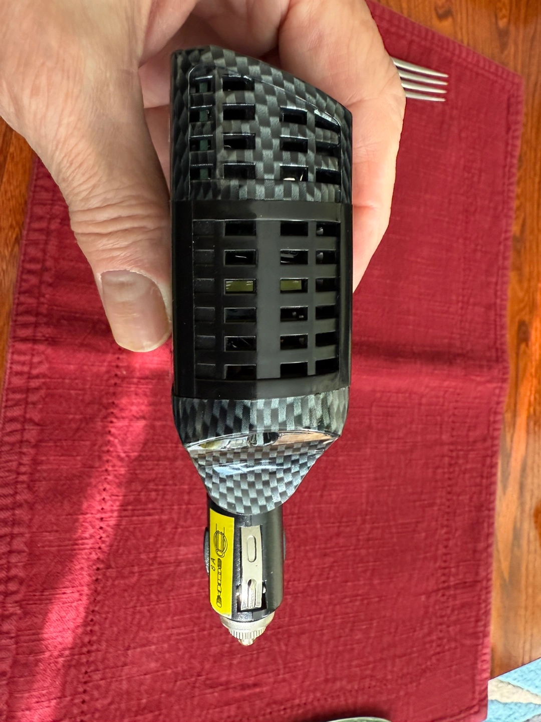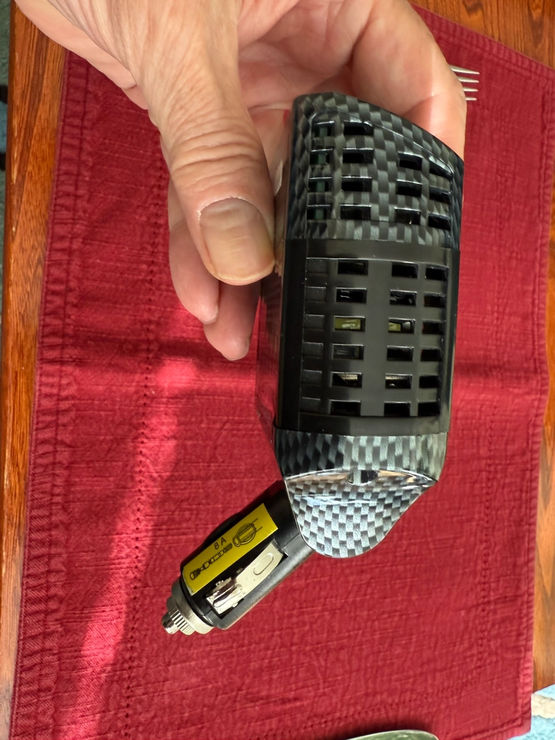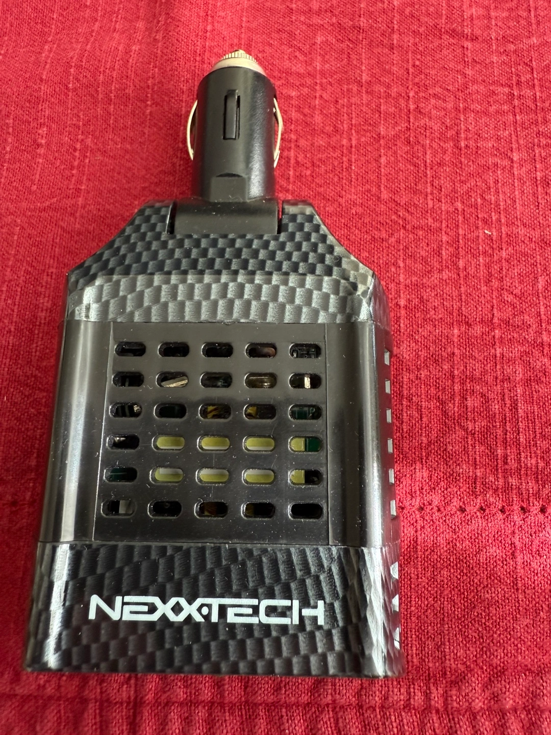 Portable car power inverter. Features USB and AC outlets. Carbon fibre patterned casing. Includes 12V car charger plug.