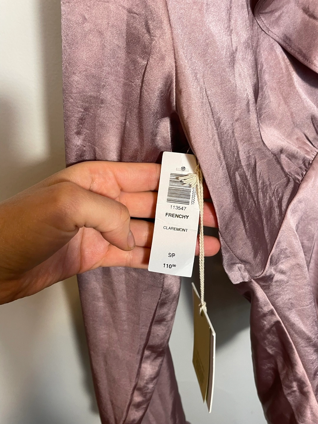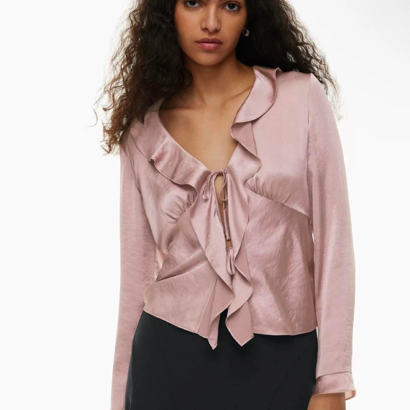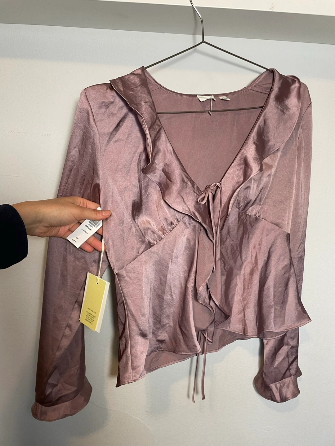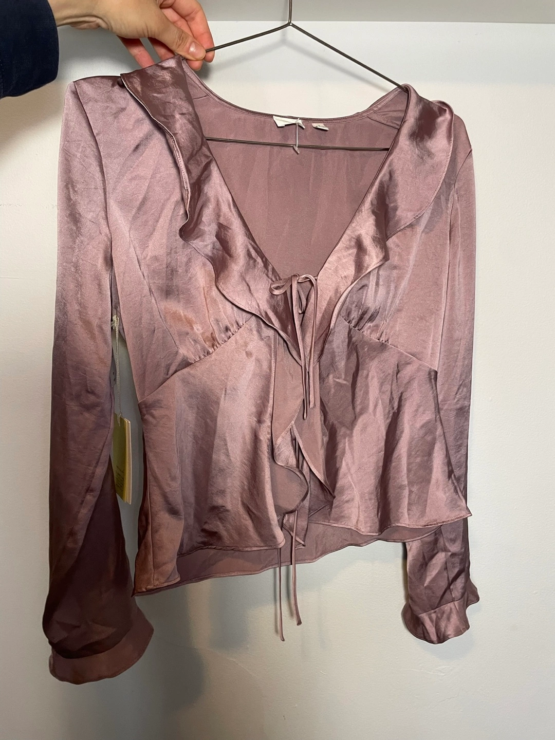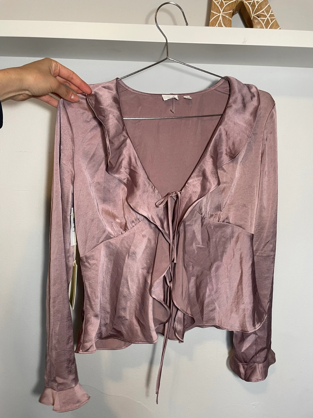 Dusty rose coloured satin blouse. Features long sleeves, ruffles, and a tie at the front. Size small. New with tags. If the ad is still on is AVAILABLE Pick up at Dufferin and st Clair See my other listings for a bundle pricing if interested in another item :) Cash only Purchases of $50 or more get a free GIFT