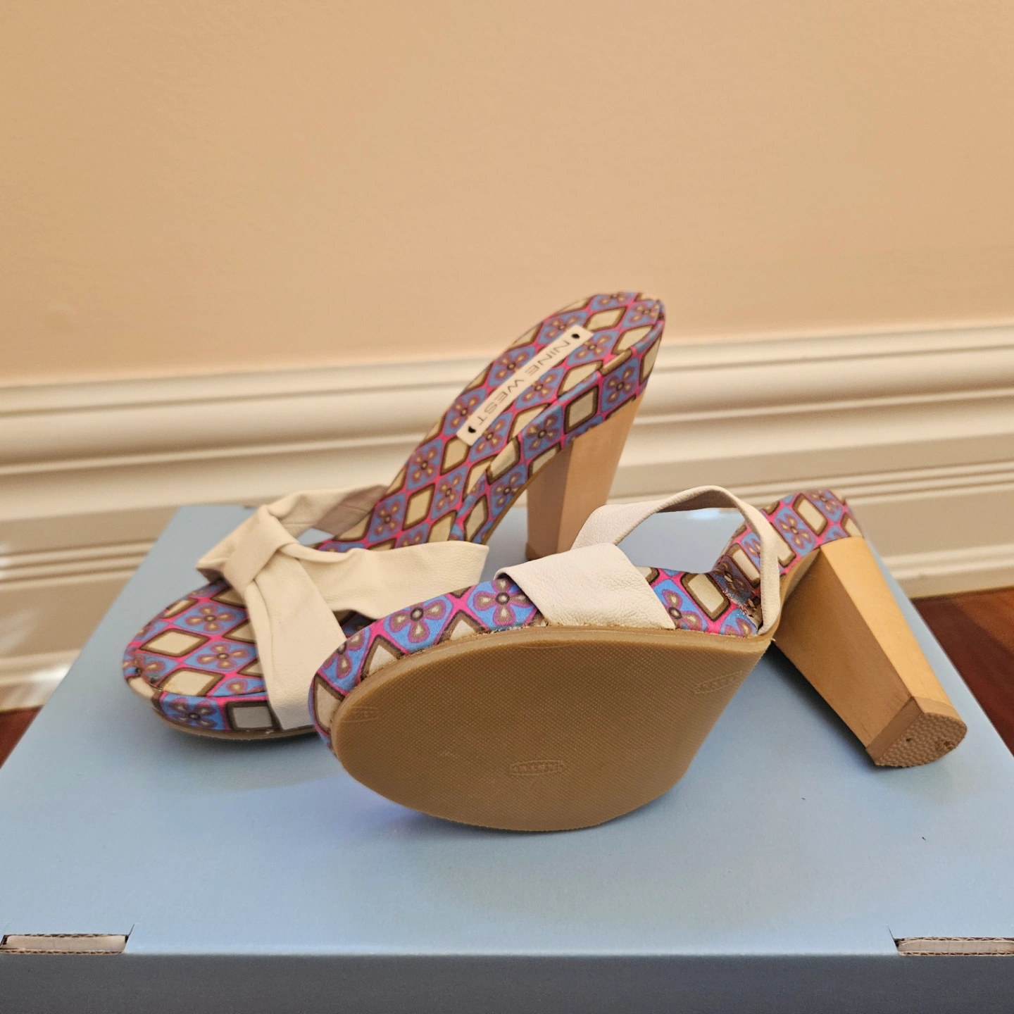 Adorable Nine West slides. Featuring a colourful patterned platform and chunky heel. Cream coloured fabric bow detail. Open toe and slip-on design.