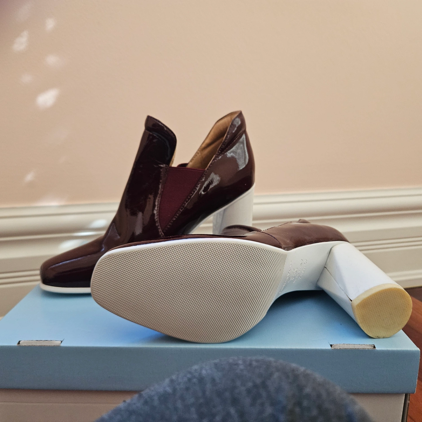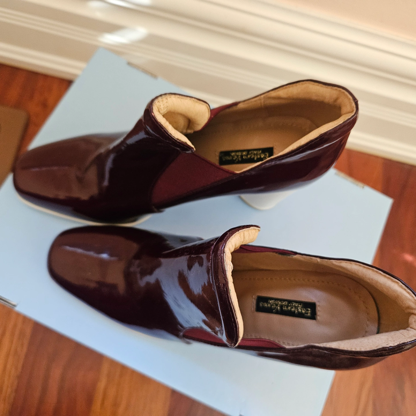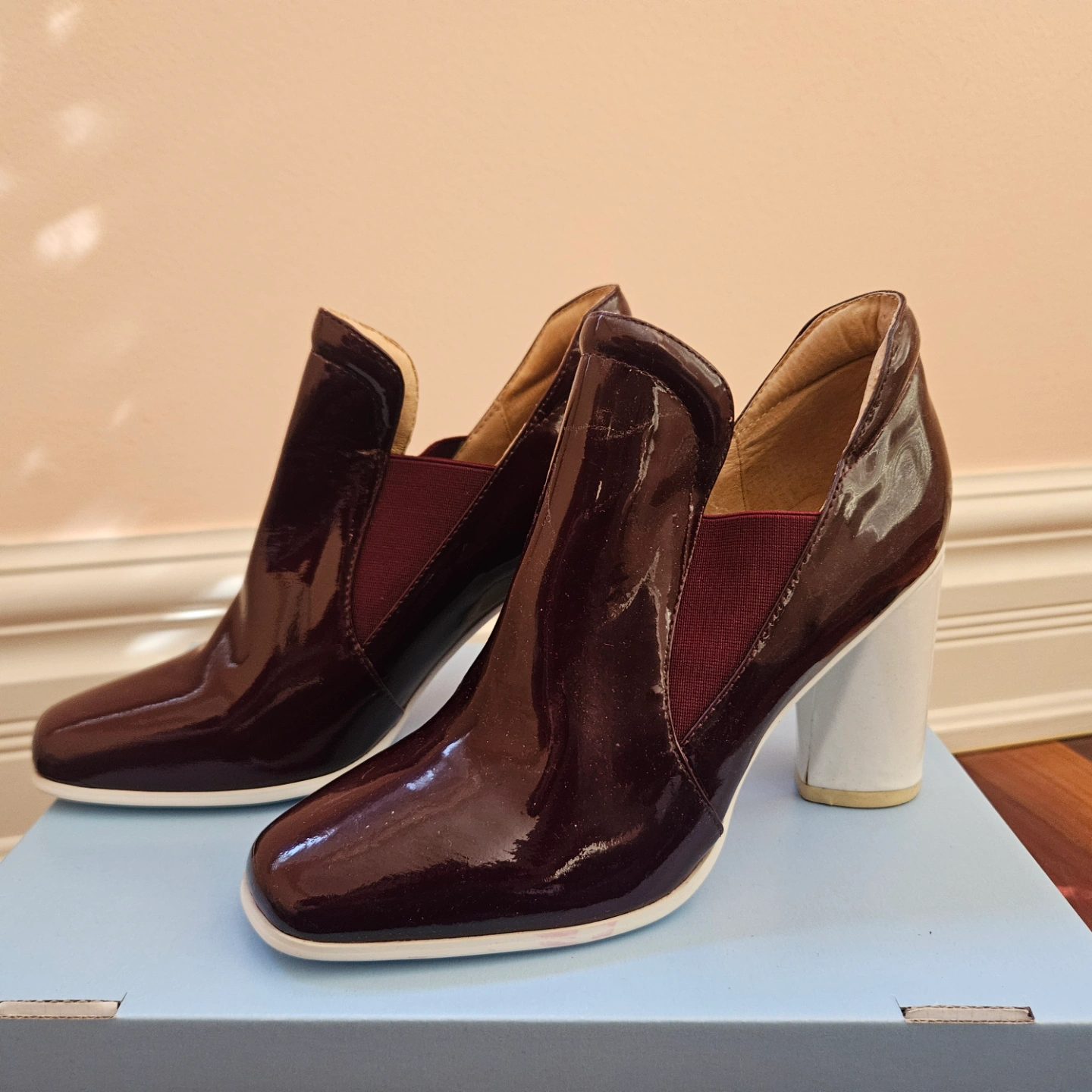 Stylish burgundy patent leather ankle boots. Features a block heel and elastic side panel. White platform sole. Great for a night out or special occasion.
