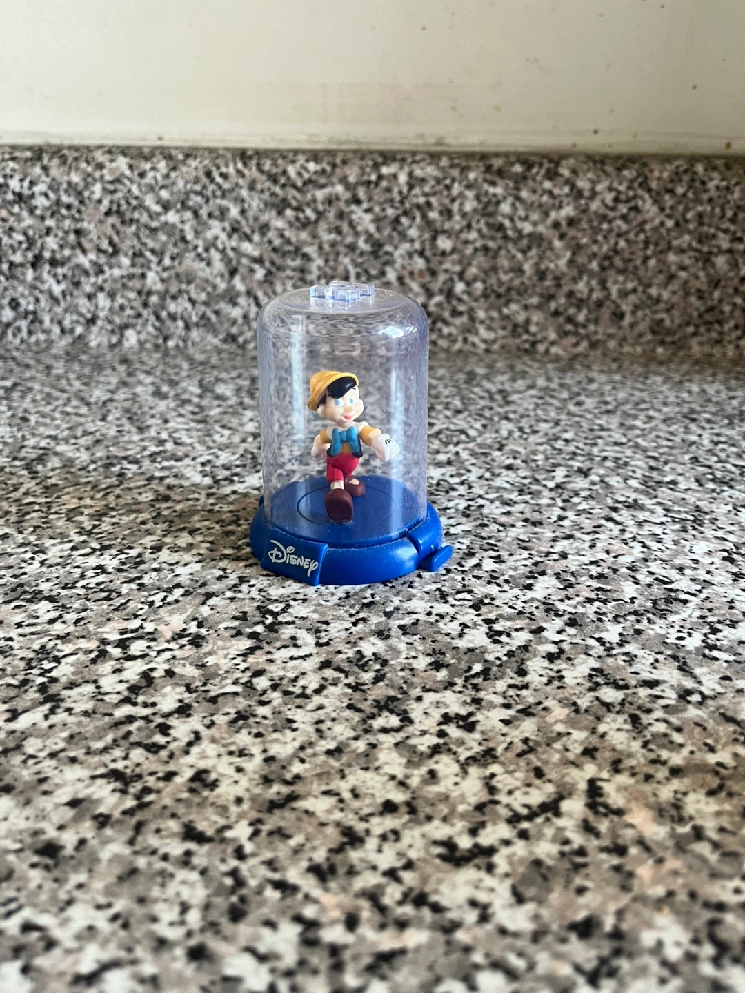 Collectible figurine of Pinocchio. Small plastic figure inside a clear plastic dome. Blue base with Disney logo. Pick up only.