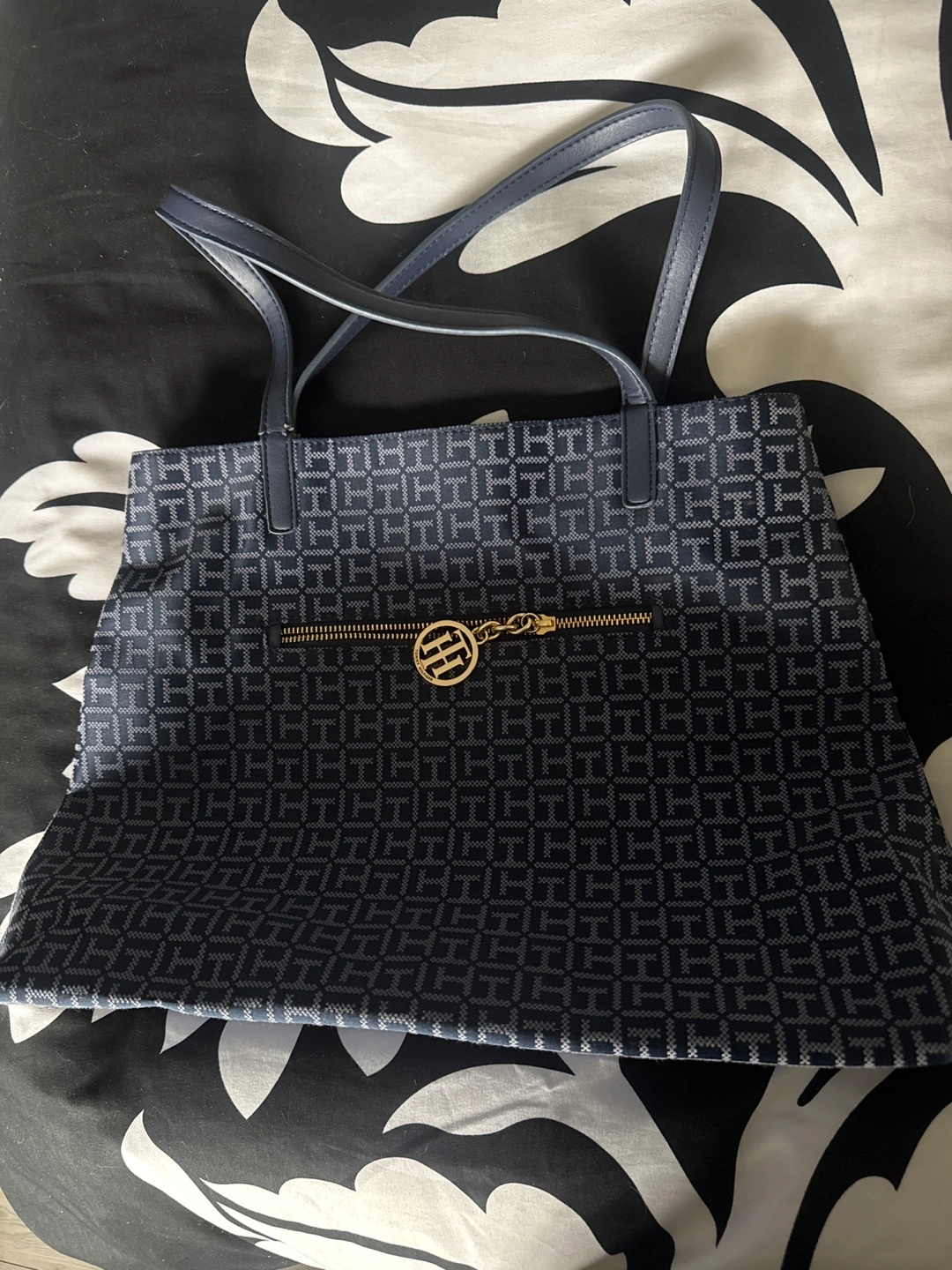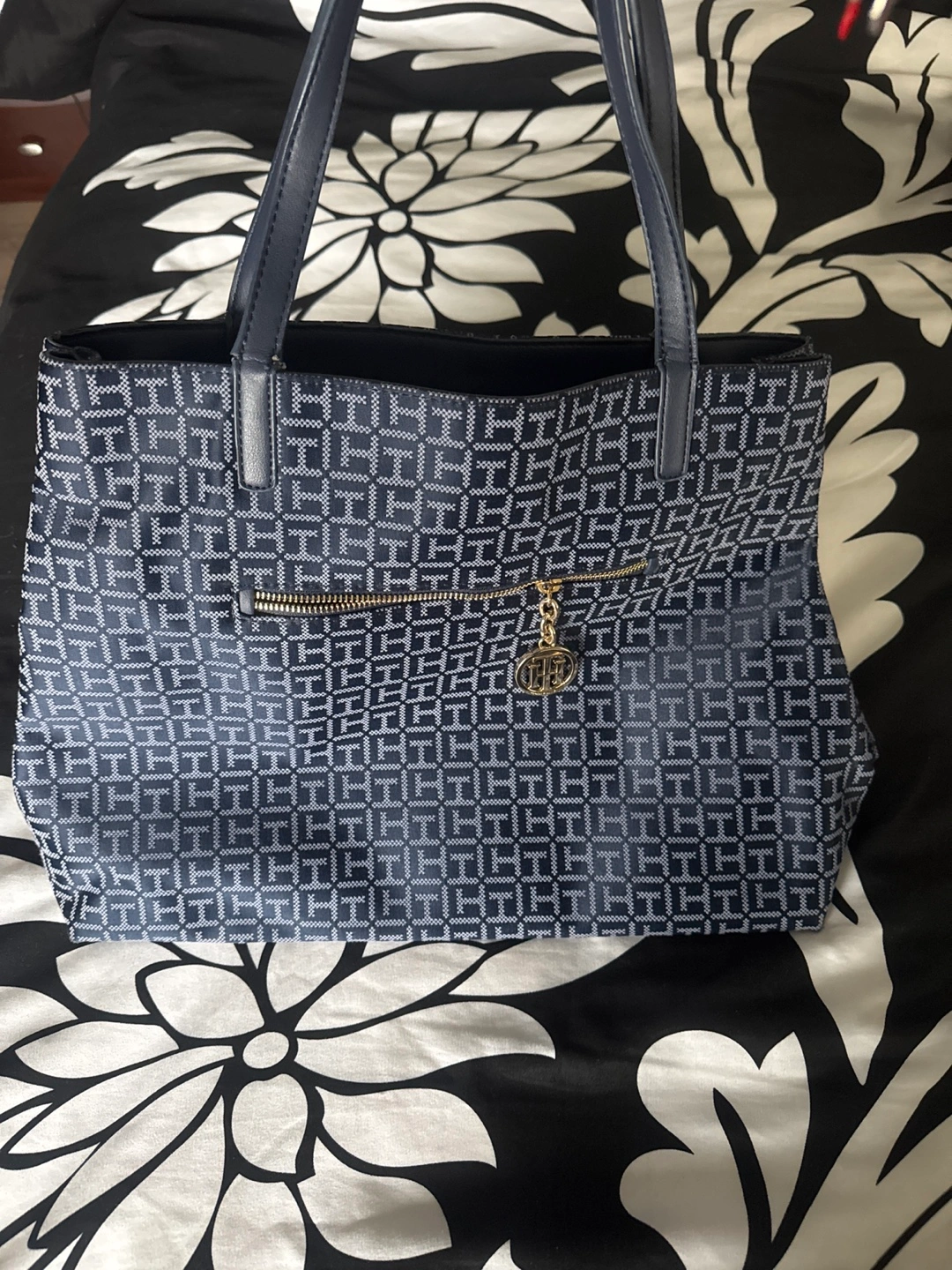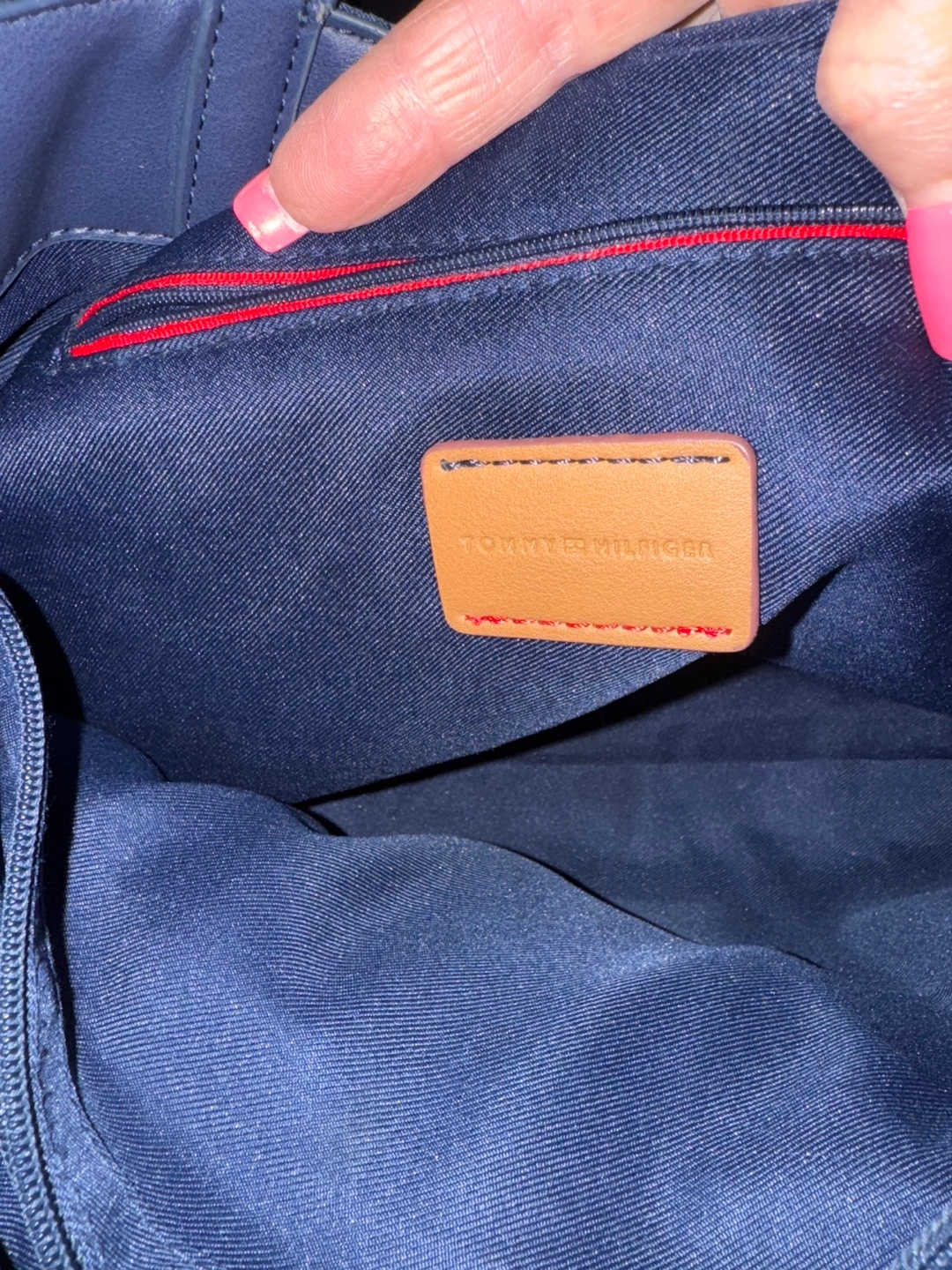 Stylish navy blue tote bag. Features Tommy Hilfiger logo. Top handles. Zipper closure. Interior pocket. Strap 17”