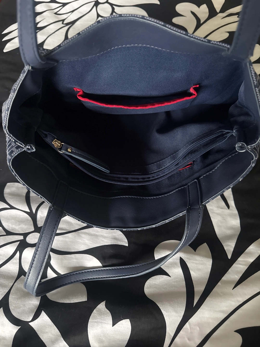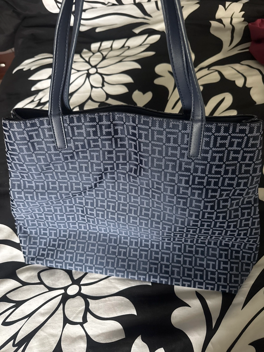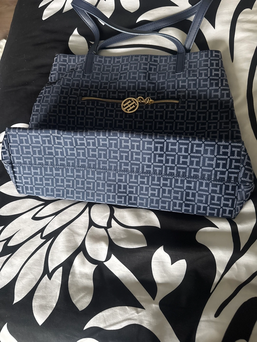 Stylish navy blue tote bag. Features Tommy Hilfiger logo. Top handles. Zipper closure. Interior pocket. Strap 17”