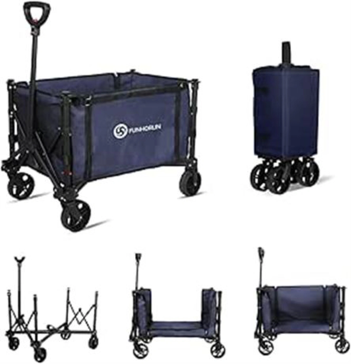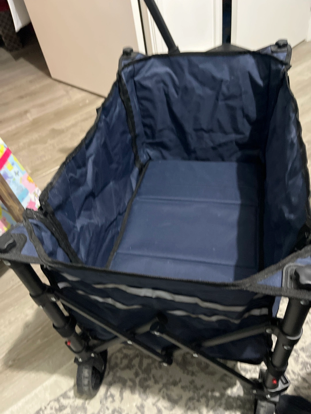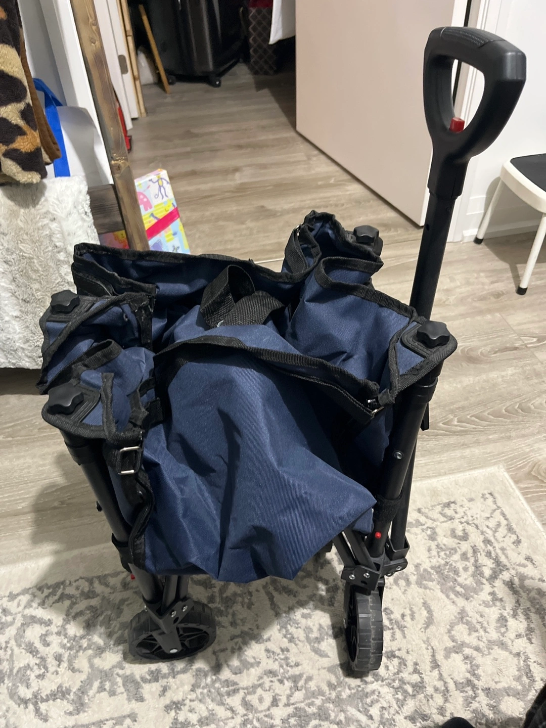 Portable wagon, easy to fold and store. Durable fabric and metal frame. Great for hauling items, groceries, and more. Features a pull handle and all-terrain wheels. Got 2 looking to part way with 1 of them retails for 130 looking for 100