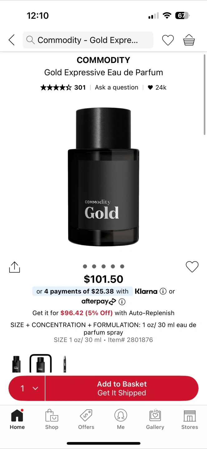 Commodity Gold Eau de Parfum. 30ml bottle. Key notes: Amber, Vanilla, Sandalwood. Sprayed once. Retails for $101.50 +tax