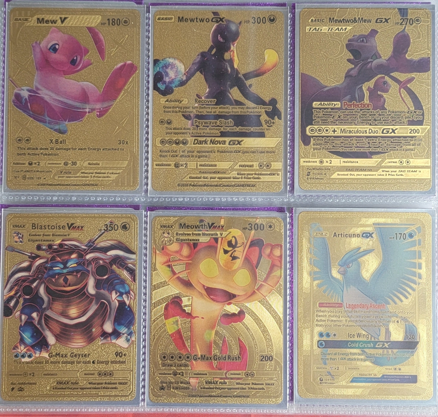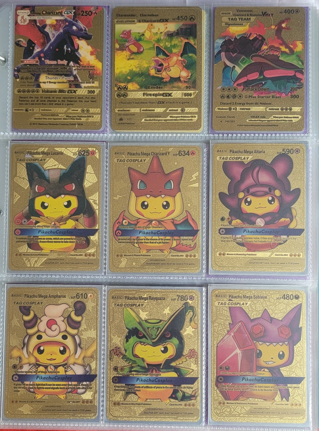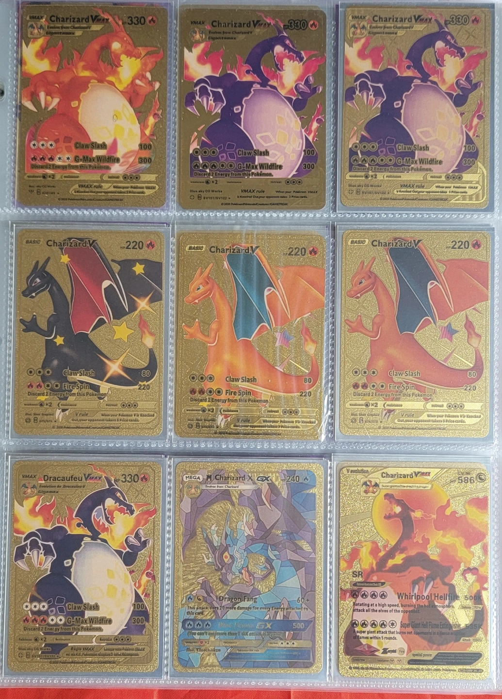 Multiple Pokémon cards. Various Charizard cards, including V, VMAX, and GX versions. Other cards feature Pikachu, Mewtwo, and more. Gold-patterned cards. Excellent condition. PLUS MORE CARDS THAT ARE NOT IN PICS!!!!!