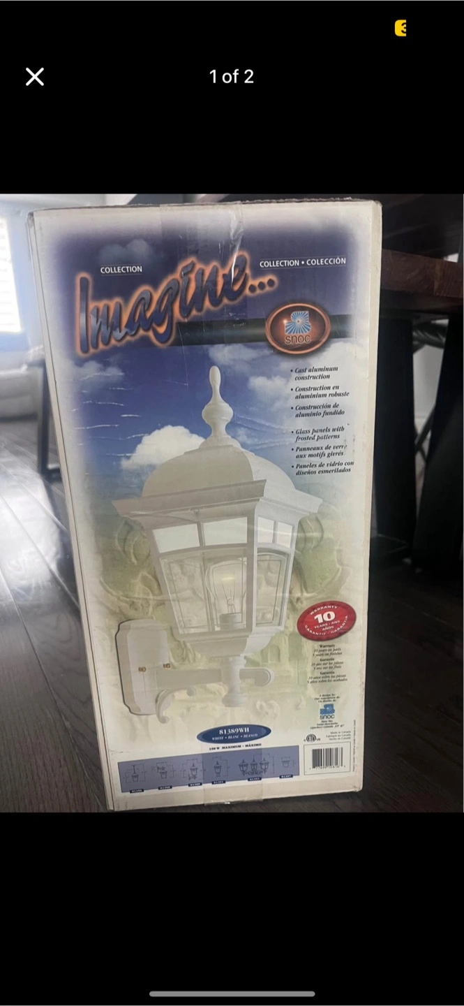 Used in box. White outdoor wall mount light fixture. Cast aluminum construction. Glass panels. Upward mounting. 2 available