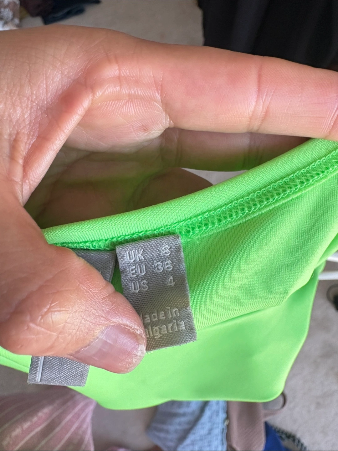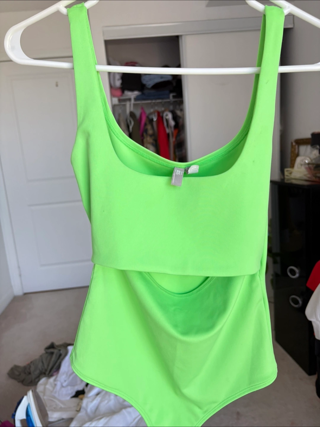 Bright lime green bodysuit. Cut-out detail at the waist. Snaps at the bottom. Size 4.