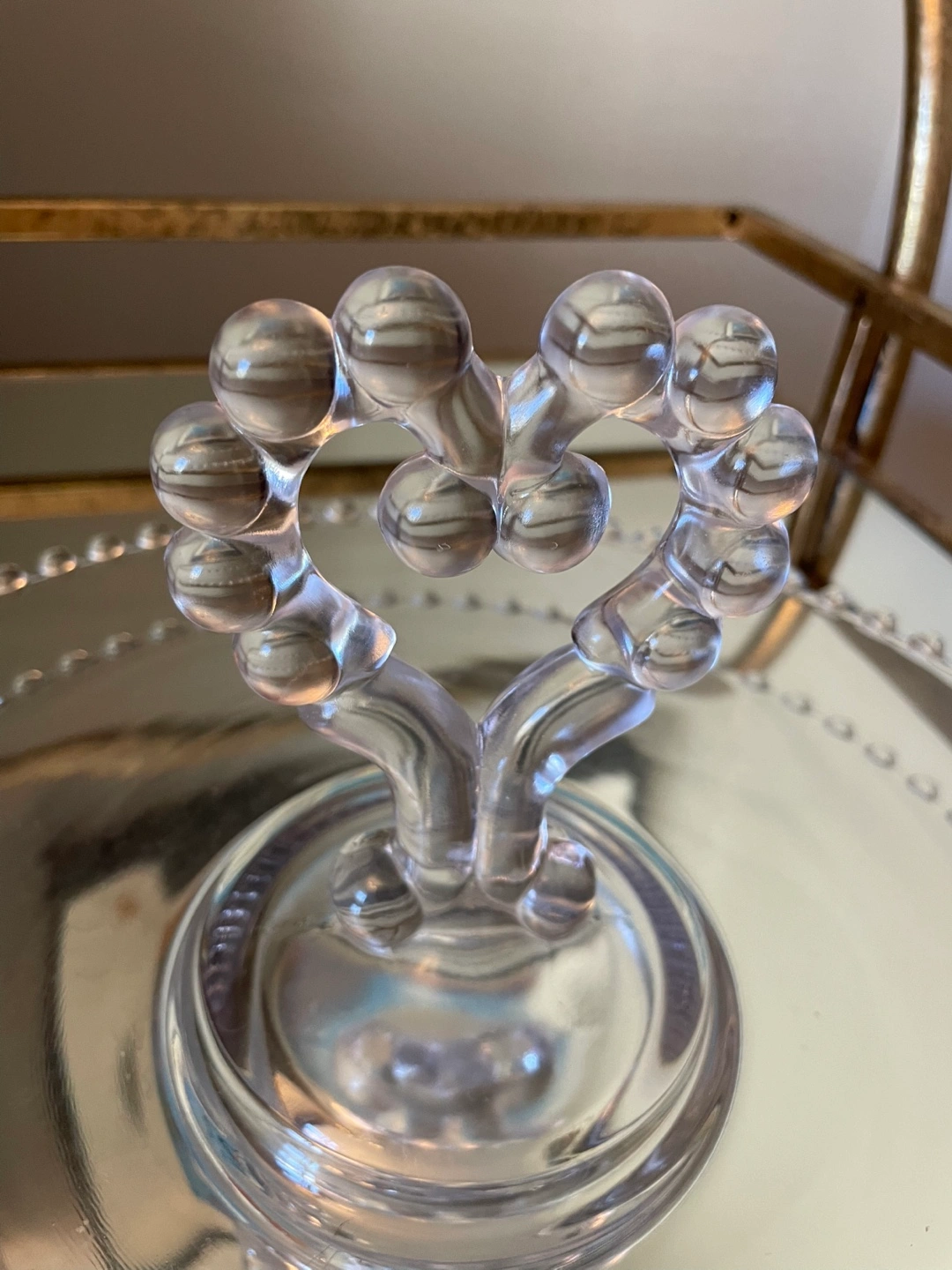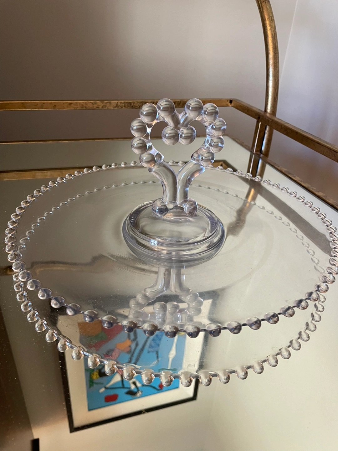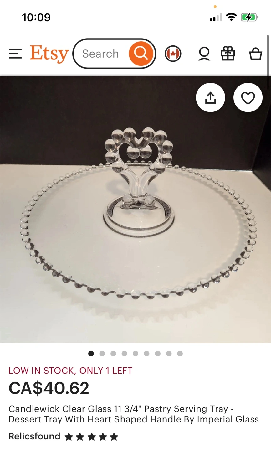 Clear glass dessert tray. Features a heart-shaped handle and beaded edge. Excellent condition. Located in Osborne Village with easy accessible driveway for pickup . This Clear Glass Candlewick serving tray with heart shaped handle is in pristine condition . No chips , no cracks . Measures approximately 11” inches diameter. Perfect for pastry , sushi, appetizers etc. Accepting etransfer for guaranteed hold . Cash FCFS or square reader for debit and credit , Apple Pay at pick up with prior authorization . Please see my other listings for more . Thanks