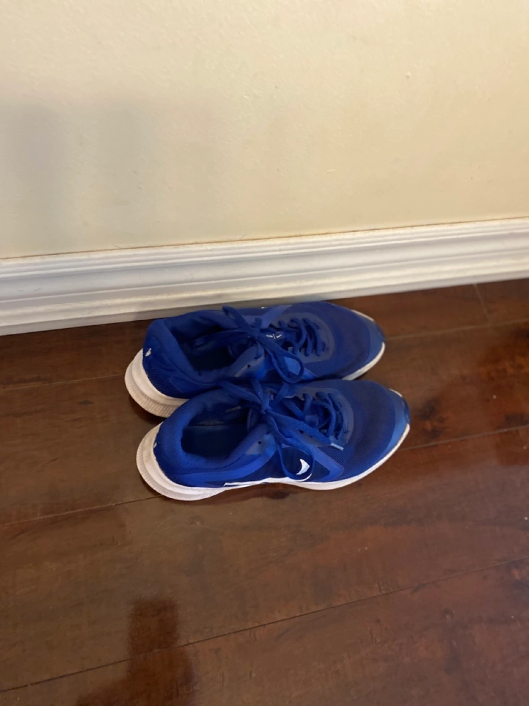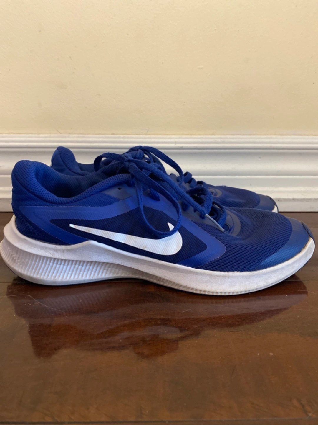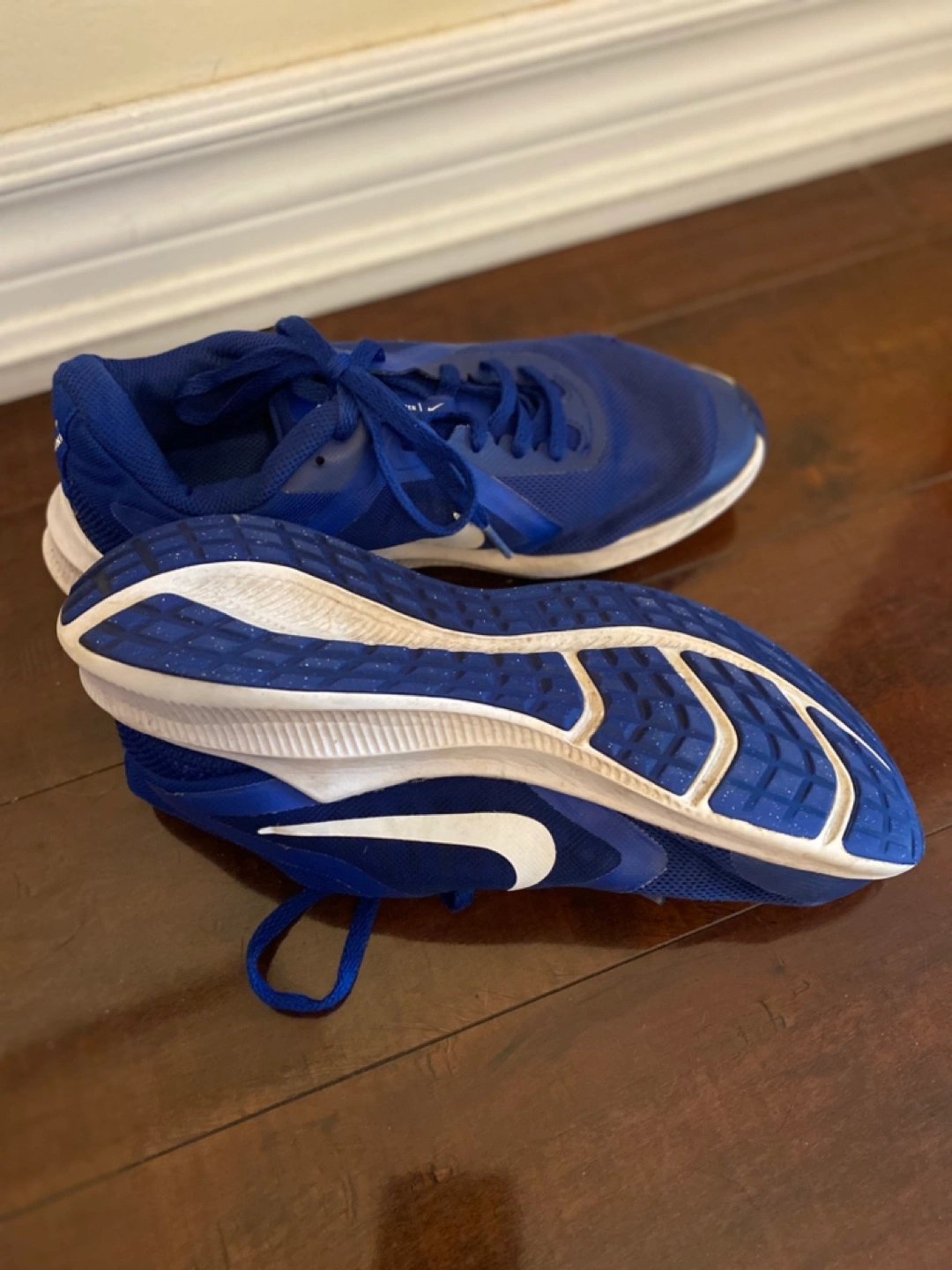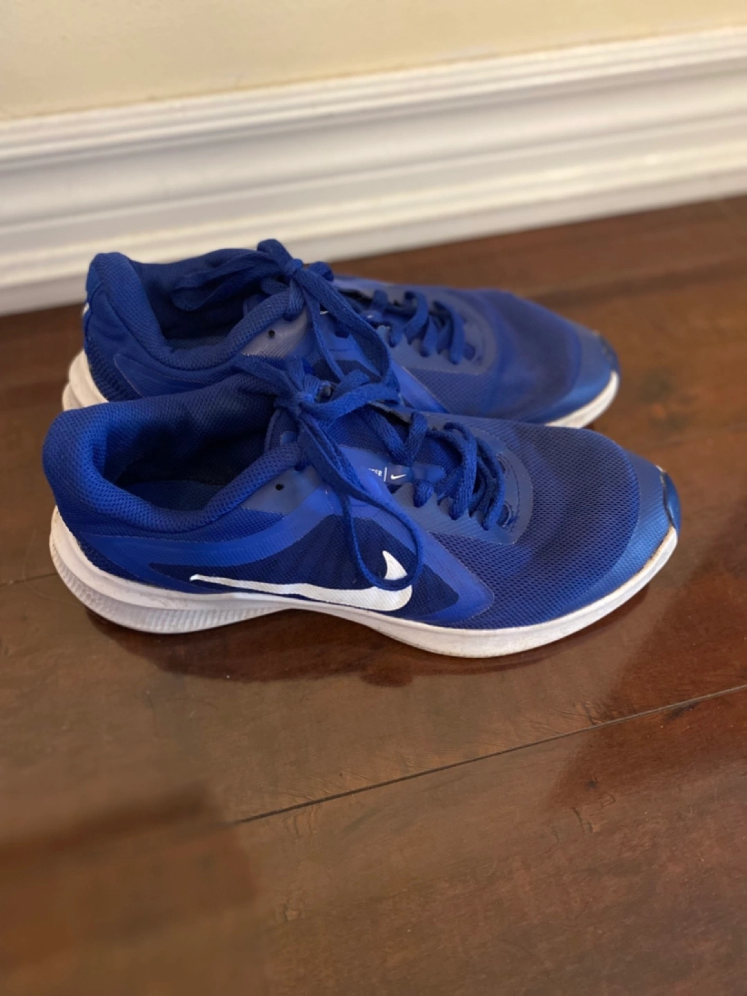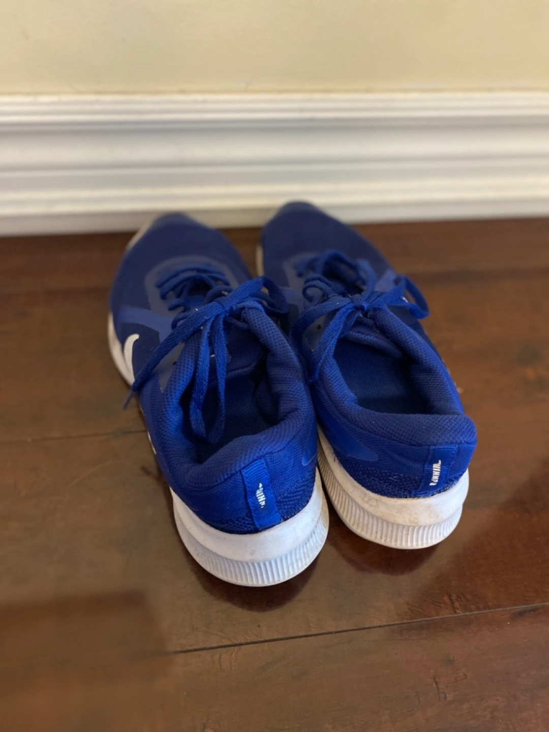 Blue Nike running shoes. Lace-up closure. Comfortable and stylish.