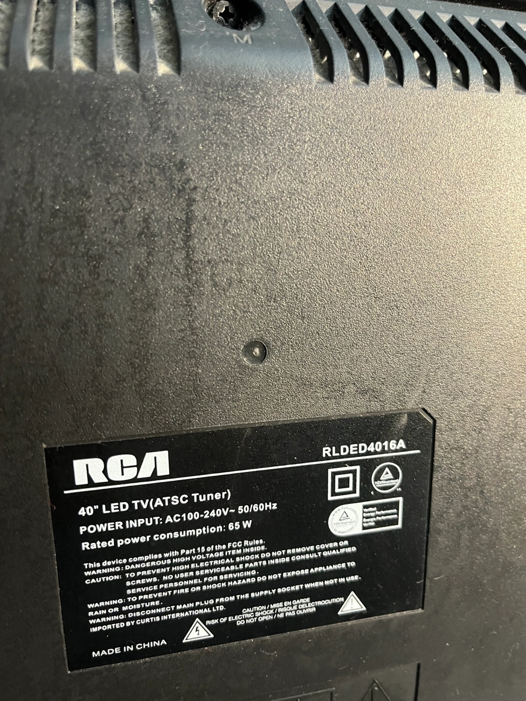 40 inch RCA LED TV. ATSC tuner. Includes remote. Good condition. TV stand is also available for extra. Thanks