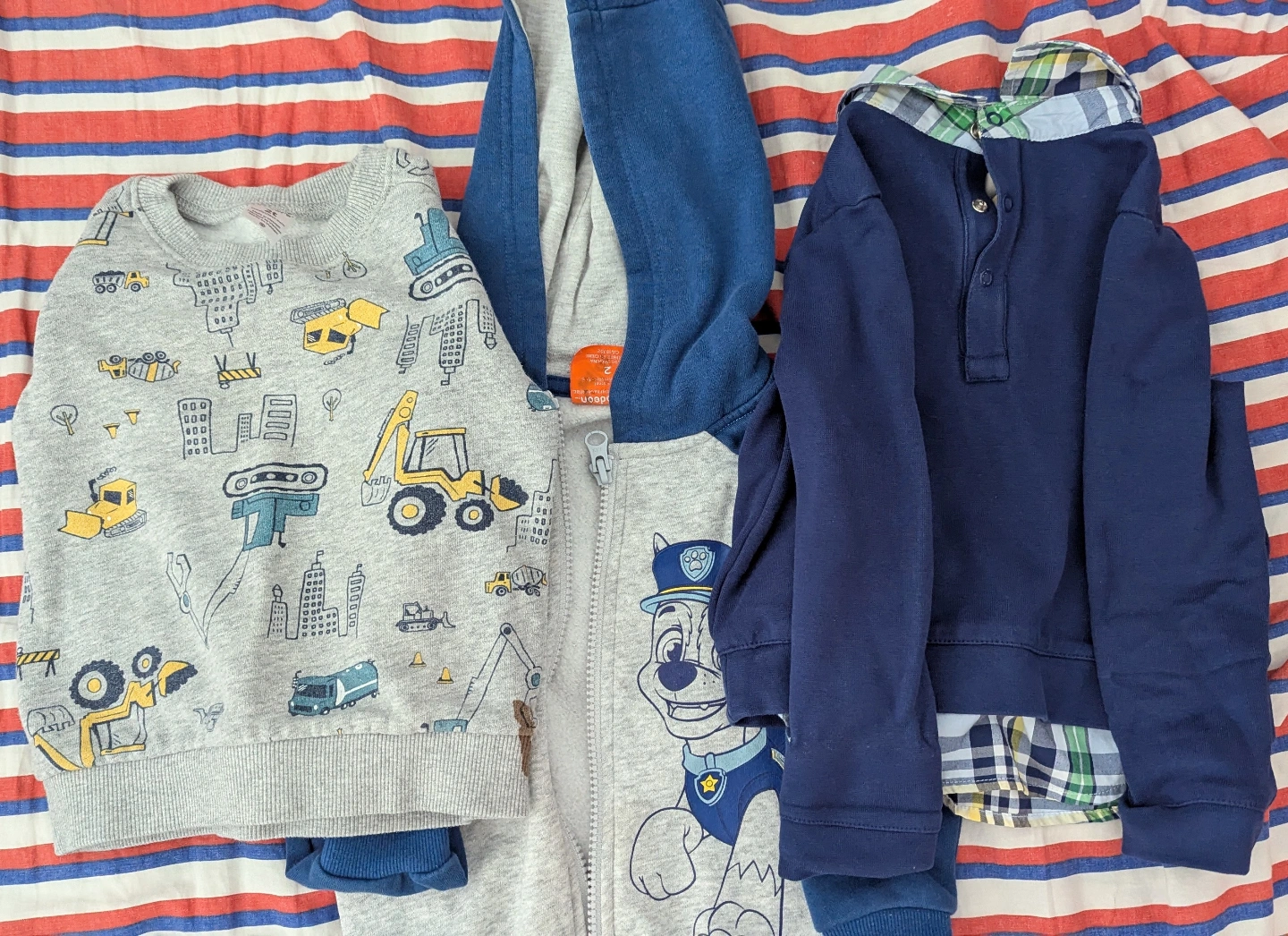 Bundle includes three toddler boy's clothing items. Grey sweatshirt with construction vehicles print. Grey zip-up hoodie featuring Chase from Paw Patrol. Navy blue sweatshirt with plaid trim. Sizes vary.